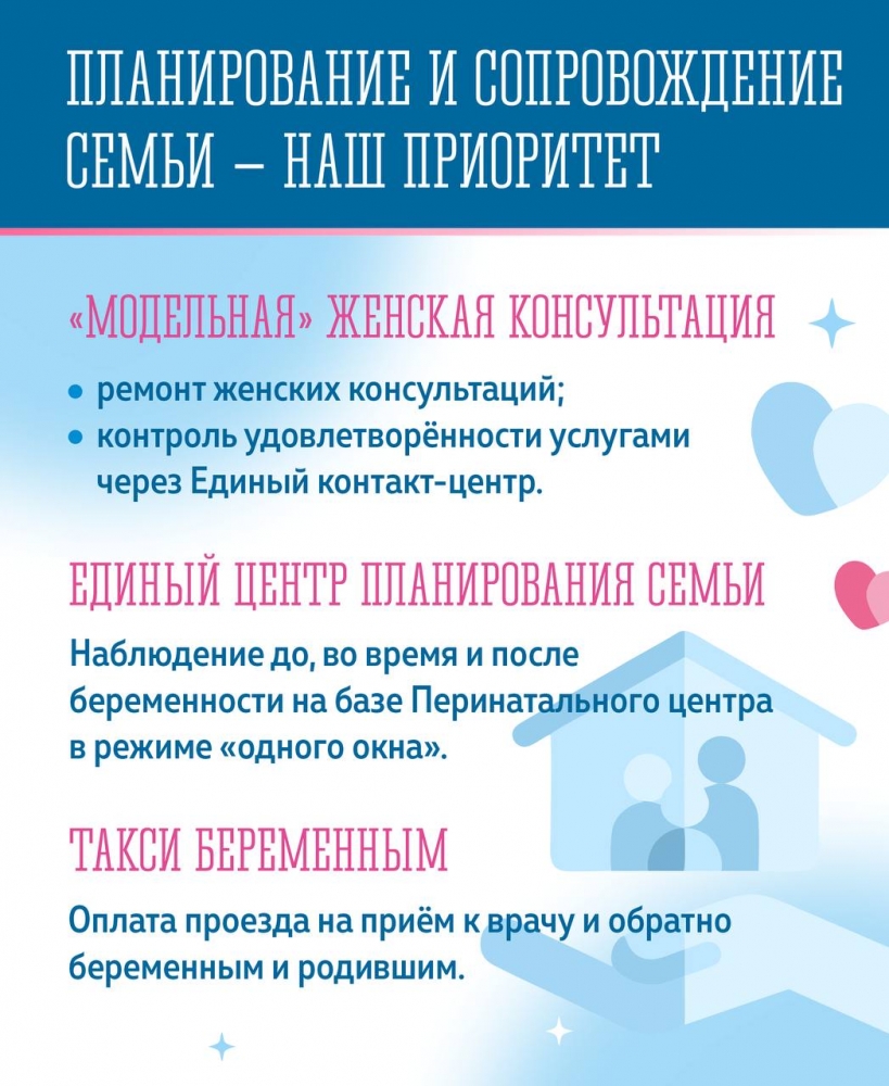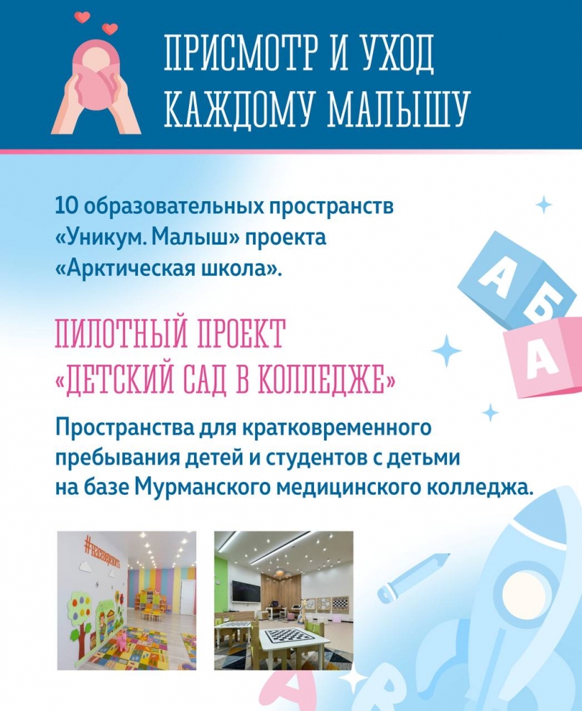 В учреждениях здравоохранения региона функционируют 11 кабинетов «Школа беременных» и 13 кабинетов здорового ребенка. В пространствах «СОПКИ. СЕМЬЯ» проходят занятия для родителей, а в дошкольных учреждениях областного центра планируется открытие 6 групп с круглосуточным пребыванием. В Мурманском арктическом университете будет организована группа кратковременного пребывания для детей студентов.