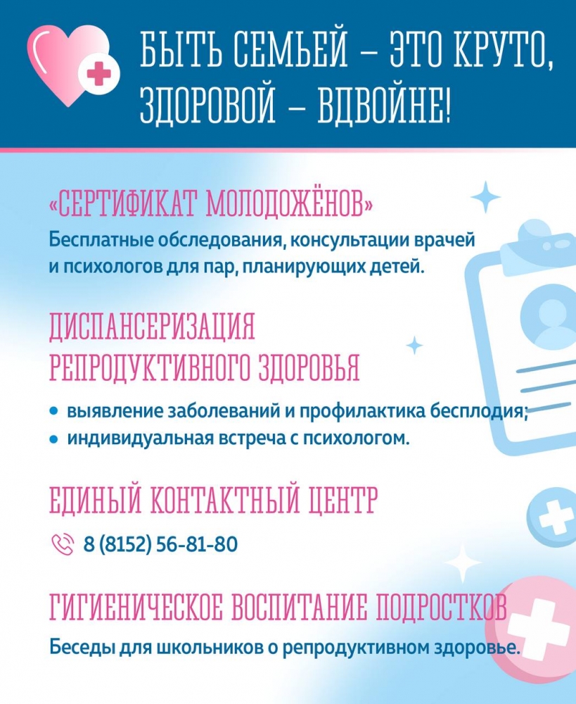 Основной целью проекта является укрепление традиционных семейных ценностей и создание комфортных условий для планирования беременности. Молодым семьям предоставляется «Сертификат молодоженов», на базе Мурманского областного перинатального центра будет создан единый центр планирования семьи, где можно будет сдать все анализы в одном месте, попасть к разным специалистам и получить консультацию.