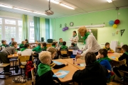 В школе №13 (пер. Якорный, 5) праздничное утро началось с энергичной и веселой зарядки на свежем воздухе: ребята присоединились к Всероссийскому марафону зарядок «Зарядка Героя».