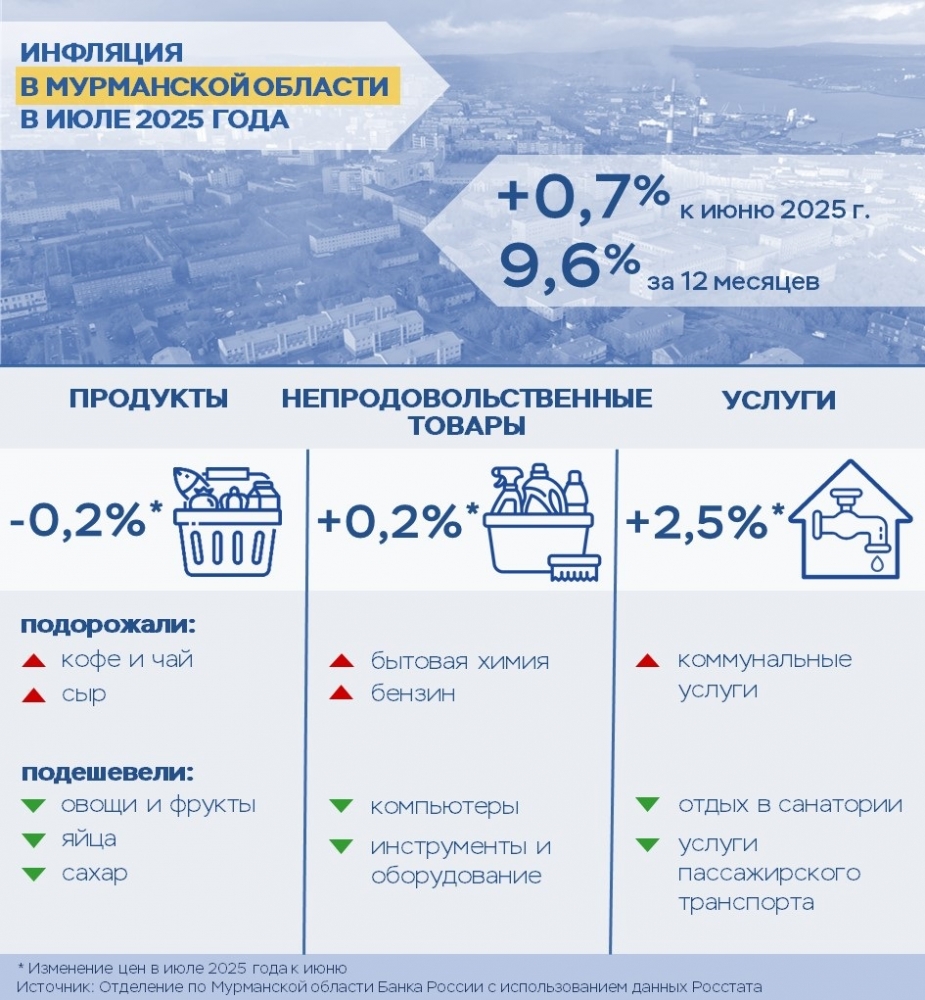 По данным Росстата, цены в Мурманской области в июле 2025 года выросли на 0,71% к июню. При этом за месяц значительнее всего подорожали услуги — это произошло из-за индексации коммунальных тарифов. Продукты в июле подешевели, а промтовары подорожали умеренно.