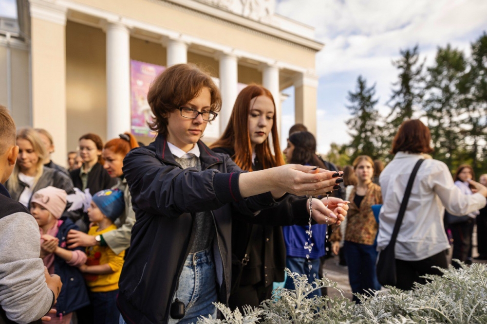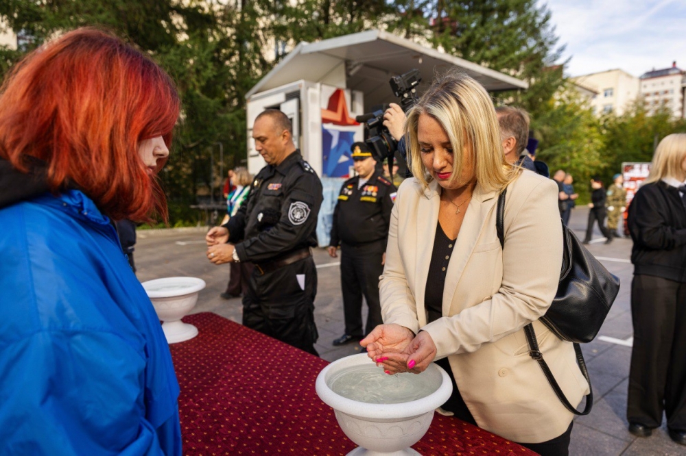 Завершила мероприятие всероссийская акция «Капля жизни»: все желающие смогли зачерпнуть воды из чаш и полить живые растения на газоне в память о страдавших от жажды детях Беслана.