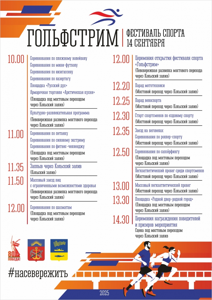 По традиции главные соревнования фестиваля — массовый легкоатлетический забег по Кольскому мосту и зрелищный заплыв через Кольский залив. Середина сентября – особенное время для региона, именно тогда уровень воды в заливе достигает своего пика, что и позволяет безопасно проводить подобные соревнования. В заплыве примут участие 35 спортсменов из четырёх регионов: Москвы, Санкт-Петербурга, Тюмени и, конечно, Мурманской области.