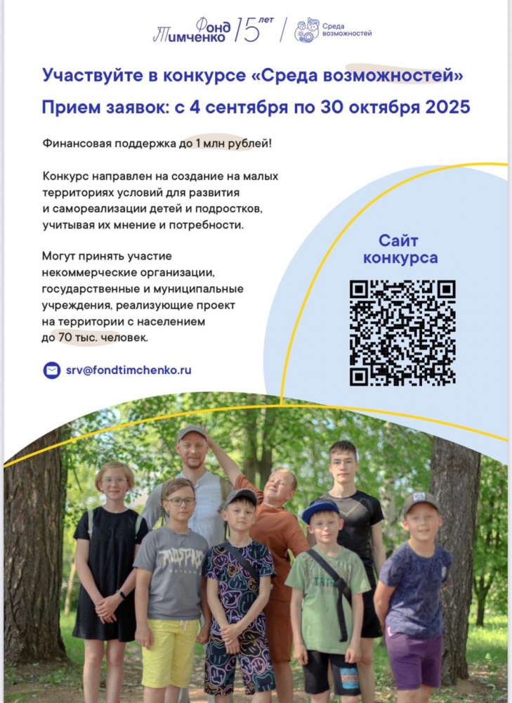Фонд Тимченко объявляет о старте приема заявок на конкурс «Среда возможностей», направленный на поддержку проектов, способствующих развитию и самореализации подростков в малых населенных пунктах.