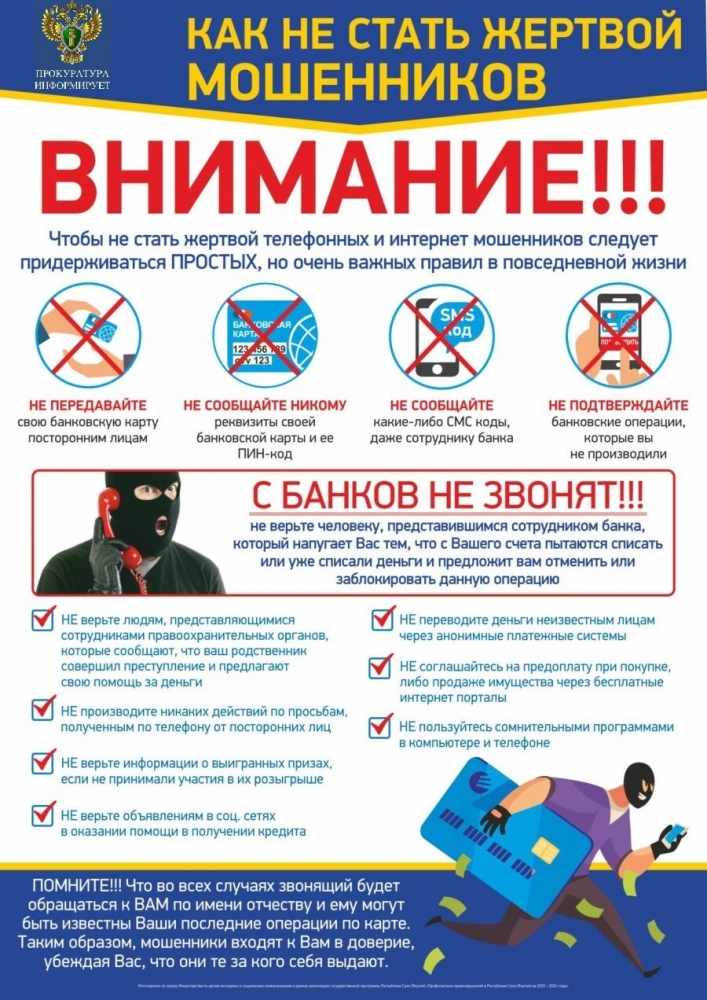 Прокуратура Ленинского административного округа г. Мурманска напоминает жителям региона о необходимости сохранять бдительность и остерегаться мошеннических схем. Телефонные звонки и подозрительные интернет-рассылки могут привести к утрате денежных средств и утечке персональных данных. Никогда не передавайте третьим лицам пароли, коды подтверждения и реквизиты банковских карт.
