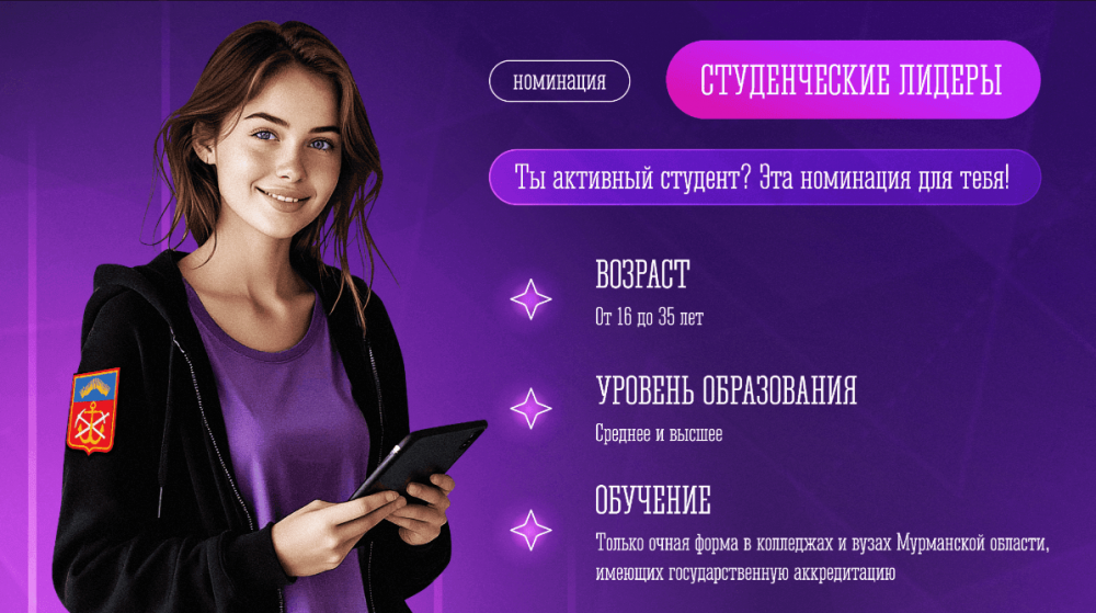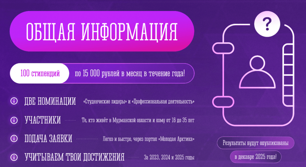 В Мурманской области открыт приём заявок на специальную губернаторскую стипендию, ежегодно присуждаемую за выдающиеся достижения в профессиональной, исследовательской, научной, творческой, управленческой, спортивной и общественно полезной деятельности.
