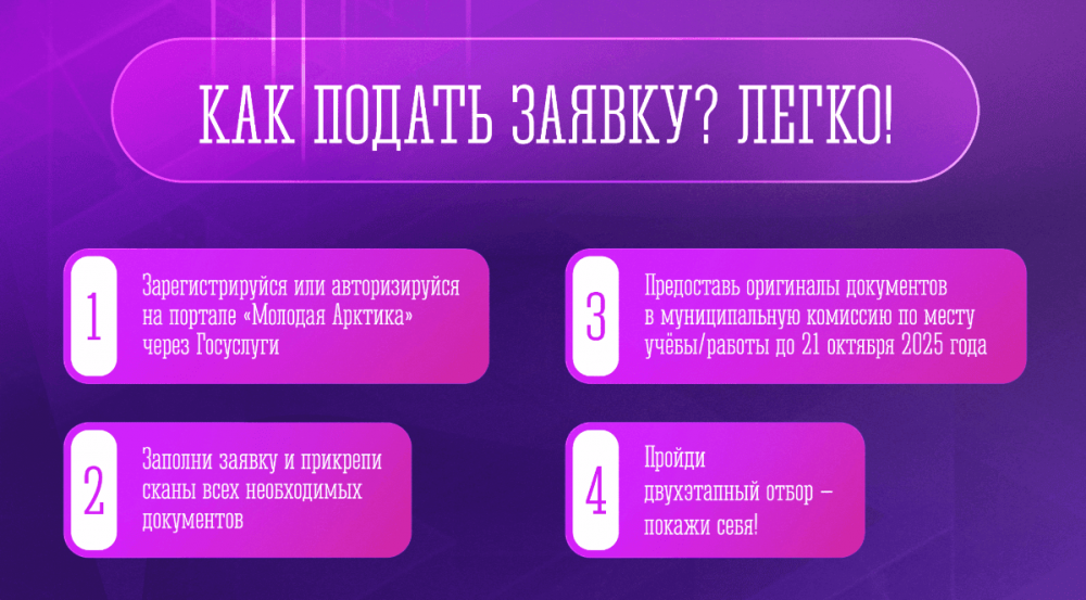 Приём заявок проводится на портале «Молодая Арктика». Заявки принимаются до 21 октября 2025 года включительно.