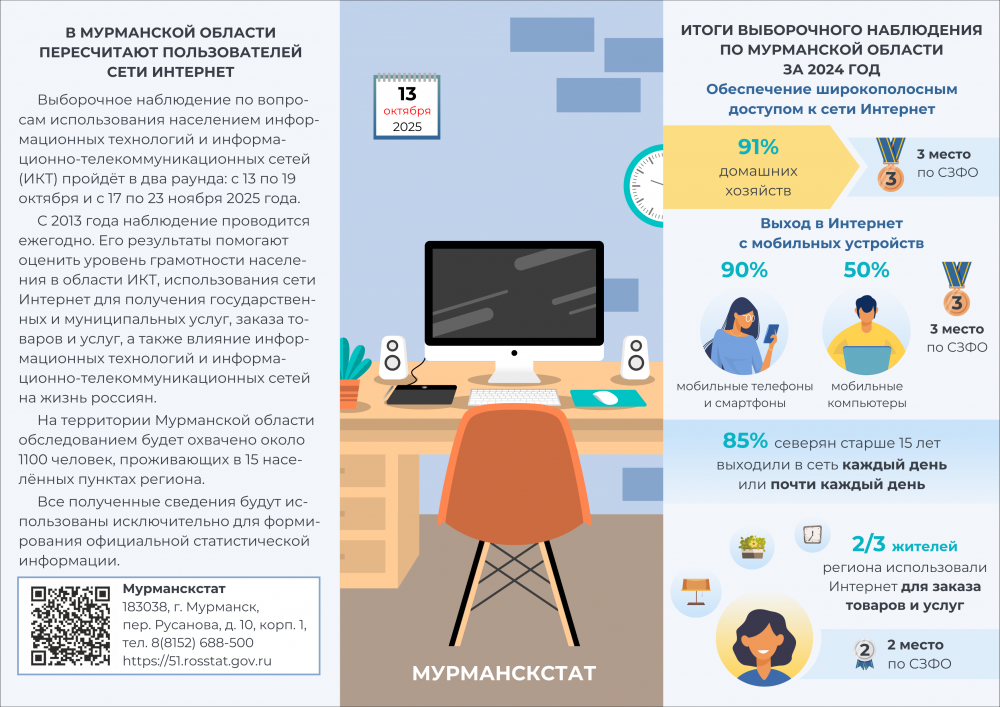 В октябре 2025 года в России стартует выборочное наблюдение по вопросам использования населением информационных технологий и информационно-телекоммуникационных сетей (ИКТ). Наблюдение проводится ежегодно с 2013 года одновременно с обследованием рабочей силы.