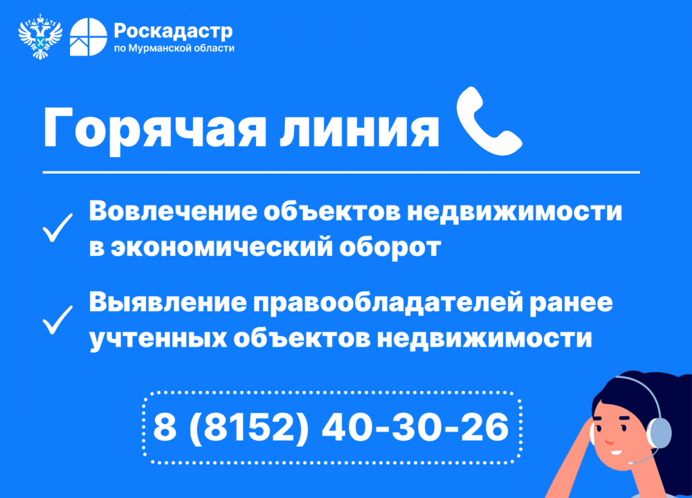 Сегодня с 10:00 до 12:00 пройдет горячая линия, посвященная вопросам пилотного проекта «Вовлечение объектов недвижимости в экономический оборот» территории г.п. Кильдинстрой и Мурмаши Кольского района Мурманской области.