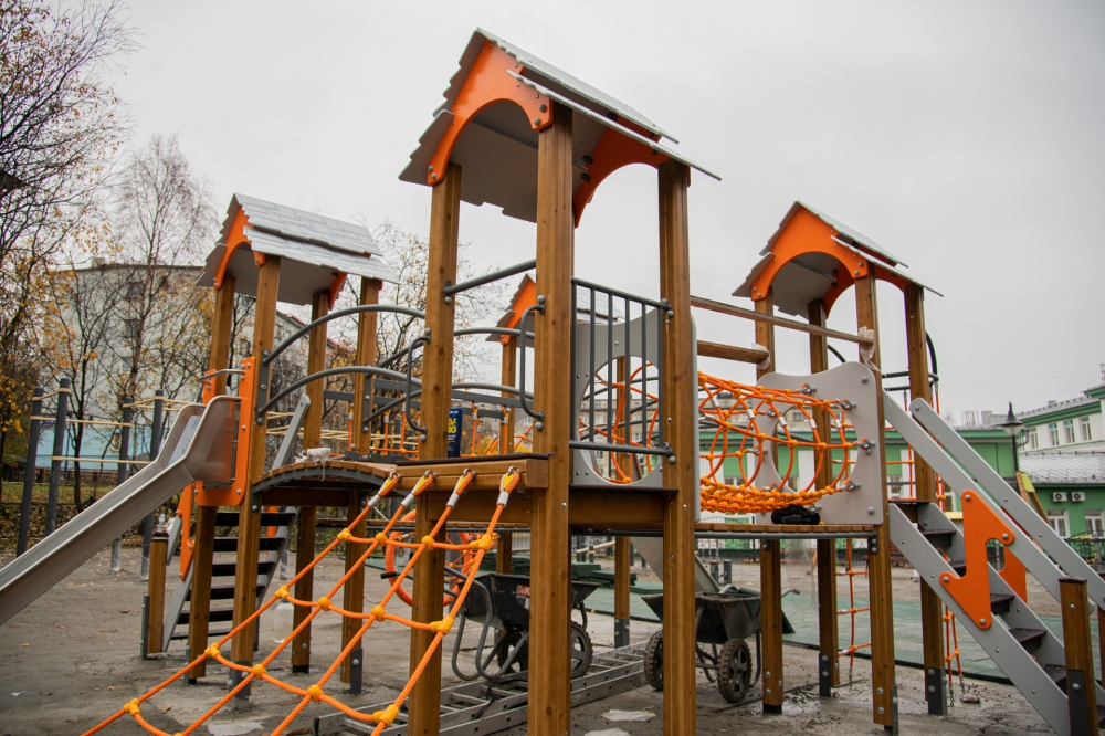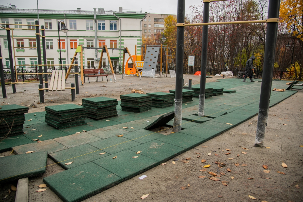Сейчас подрядчик продолжает устройство ударопоглощающего покрытия площадки площадью 601 кв. метров.