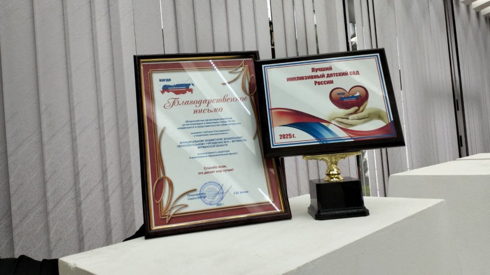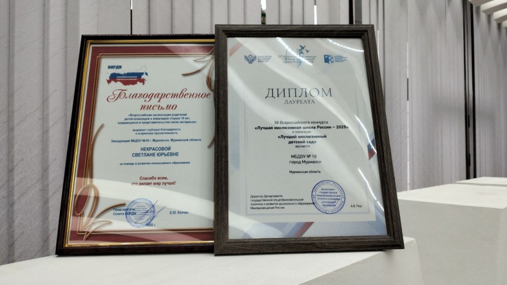 По итогам XII Всероссийского конкурса «Лучшая инклюзивная школа России – 2025» мурманские педагоги стали лауреатами в номинации «Лучший инклюзивный детский сад» и призерами в номинации «Эффективное взаимодействие с родителями», а также получили благодарственное письмо Всероссийской организации родителей детей-инвалидов и инвалидов старше 18 лет, нуждающихся в представлении своих интересов, за вовлеченность родителей в инклюзивный образовательный процесс.
