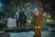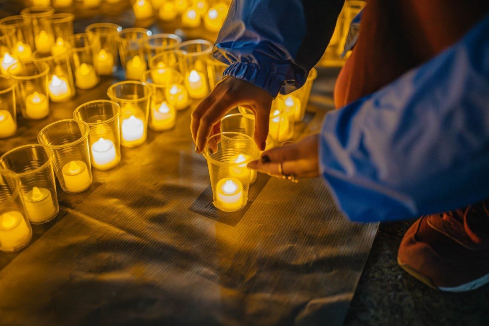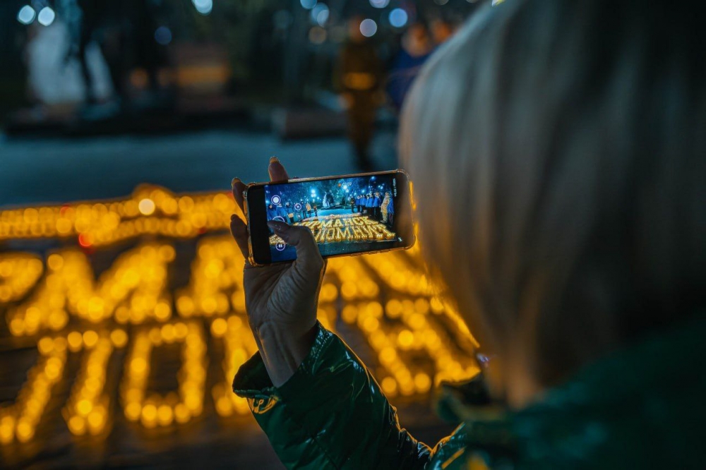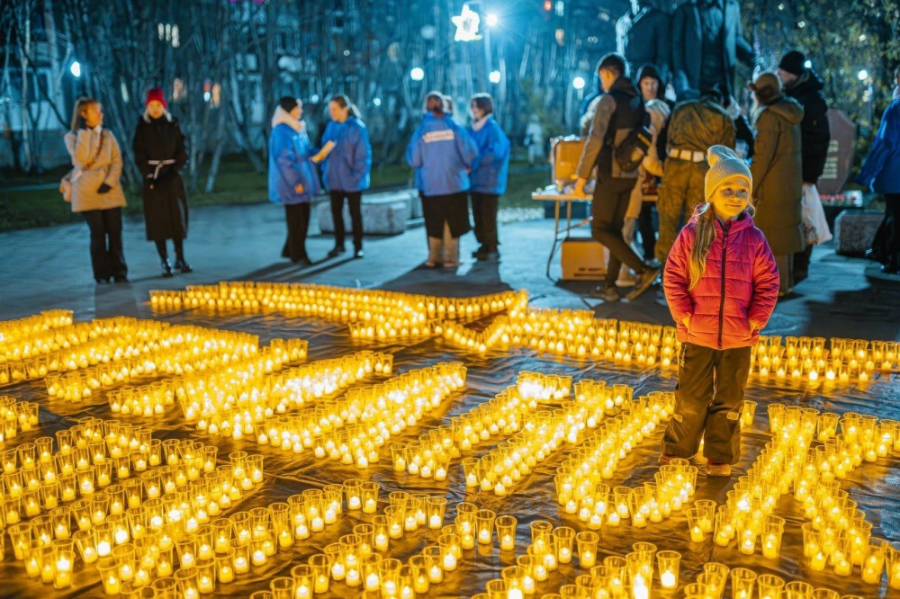 У подножия памятника воинам добровольческого соединения волонтеры ДОБРО. Центра развития волонтерского движения выложили инсталляцию из более чем 1500 горящих свеч в виде георгиевской ленты и надписи «Мурманск. Север помнит». В центре композиции, по уже сложившейся традиции, была установлена лампада, зажженная от Вечного огня у мемориала Защитникам Советского Заполярья.