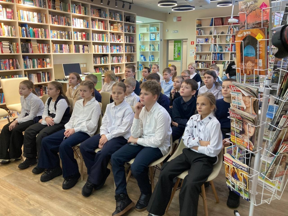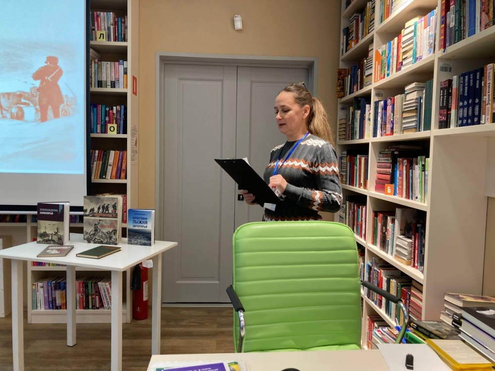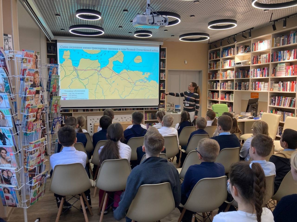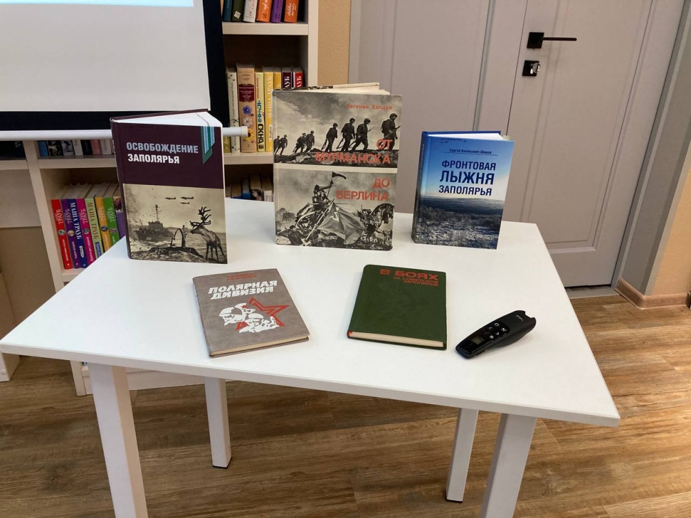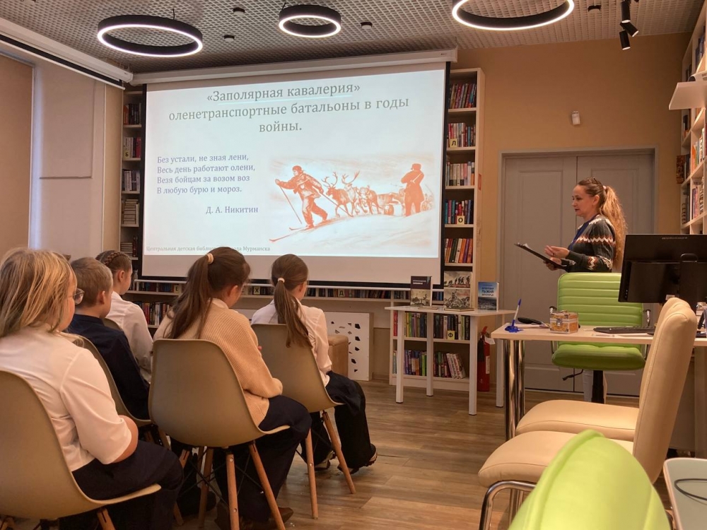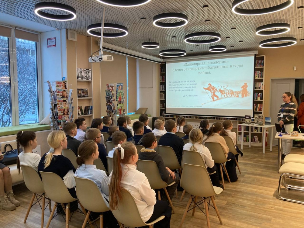 После урока библиотекари организовали для ребят просмотр краеведческих публикаций, посвящённых обороне Заполярья, включая материалы об оленетранспортных батальонах.