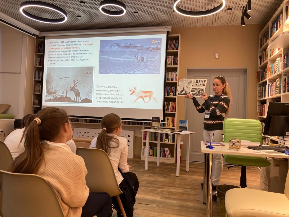 Сотрудники библиотеки доступно рассказали юным посетителям о создании оленетранспортных отрядов, их боевых задачах, значении оленей как транспортного средства в военное время и героях, которые в тяжёлых условиях Крайнего Севера использовали оленьи упряжки для выполнения важнейших военных миссий в период Великой Отечественной войны.
