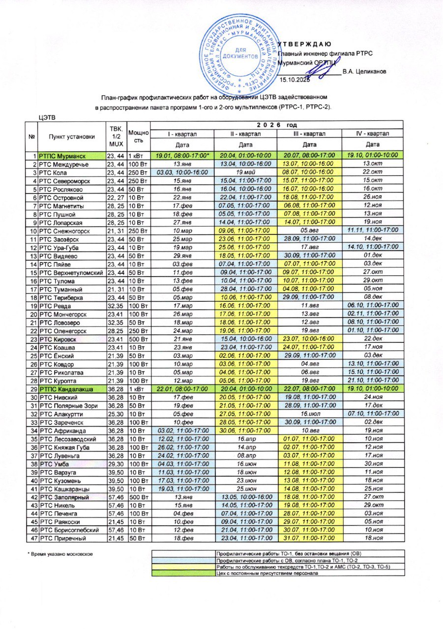 Подробную информацию о точном времени, городах и наименованиях программ можно найти в утвержденных графиках. В них указаны даты проведения профилактических работ на оборудовании ЦЭТВ, используемом для распространения программ 1-го и 2-го мультиплексов (РТРС-1, РТРС-2), а также плановые остановки FM-передатчиков в филиале ФГУП «РТРС — Мурманский ОРТПЦ».