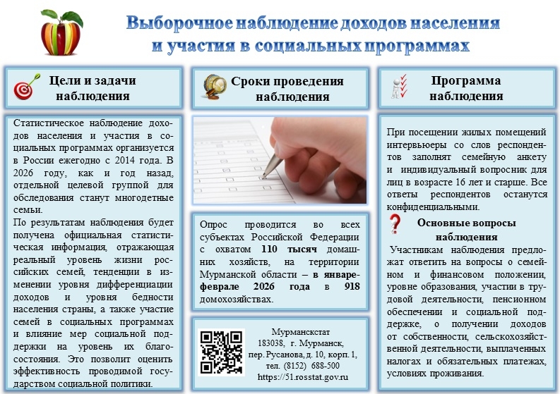 Интервьюеры проведут опрос населения в январе – феврале 2026 года. При посещении домохозяйства интервьюеры будут иметь при себе удостоверение Федеральной службы государственной статистики и паспорт. В случае каких-либо сомнений жители региона смогут уточнить информацию о статистическом наблюдении в Мурманскстате по телефонам: +7 (8152) 688-590, +7 (8152) 688-609.