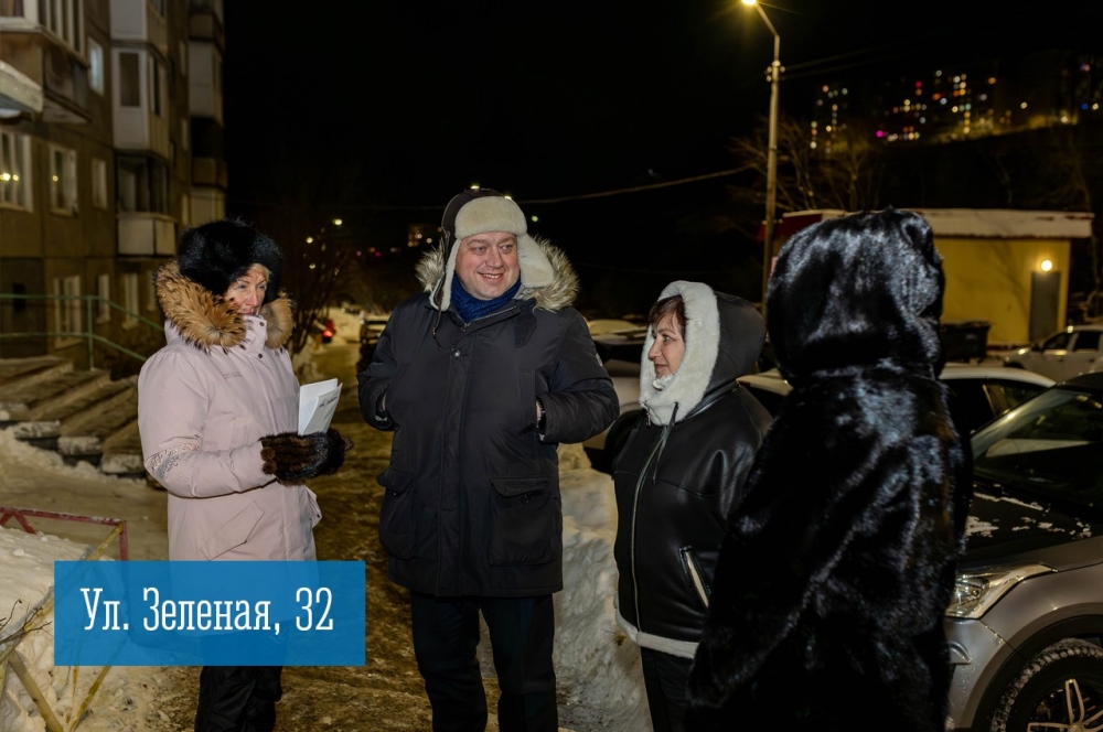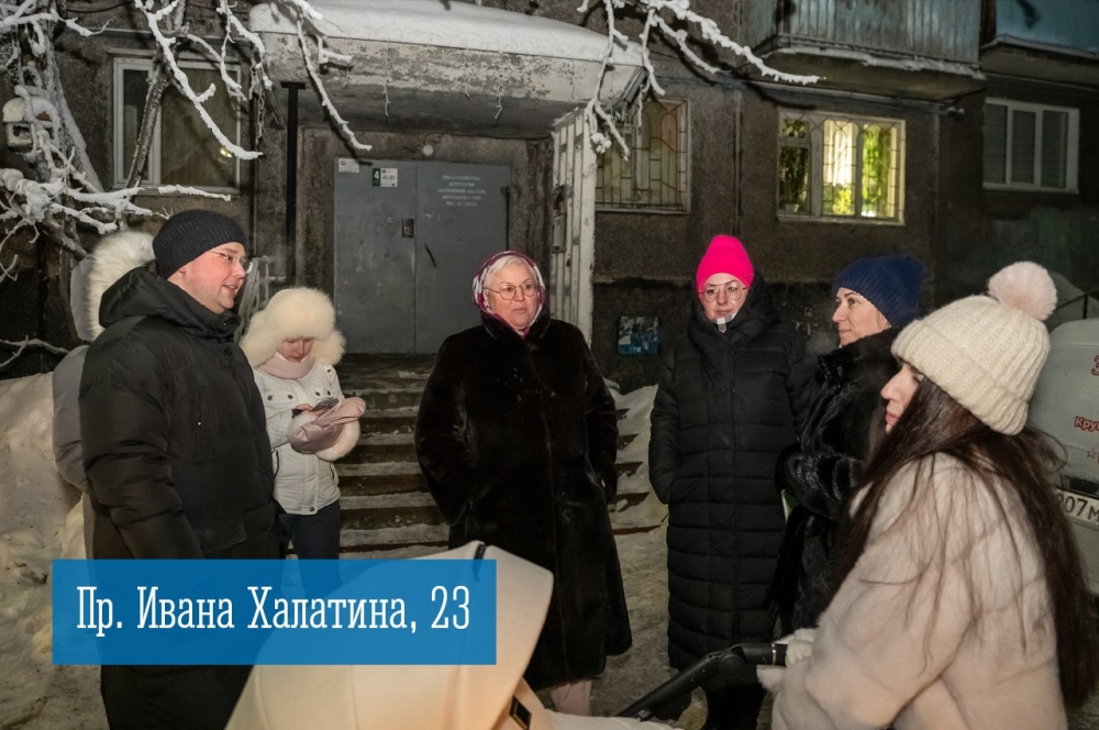 В Ленинском округе исполняющий обязанности начальника управления Вера Павлова и глава города Мурманска Иван Лебедев встретились с жильцами дома № 23 по пр. Ивана Халатина. Основной темой беседы стало участие двора в губернаторском конкурсе «На Севере – твой проект». Жильцы выдвинули инициативу строительства новой многофункциональной детской площадки на портале «Наш Север». Они также обратились с просьбой рассмотреть возможность установки шлагбаума, провести ремонт межпанельных швов и вывезти складированный снег.