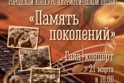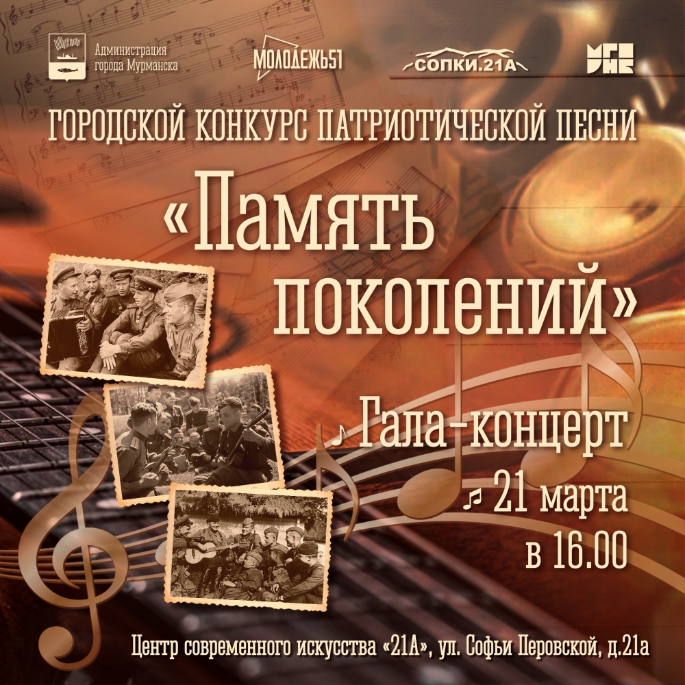 В 16:00 в Центре современного искусства «Сопки 21А» (ул. Софьи Перовской, 21А) состоится гала‑концерт городского конкурса патриотической песни «Память поколений». В рамках программы торжественного закрытия конкурса зрители смогут услышать выступления его участников. Эффектной частью мероприятия станет церемония награждения, в ходе которой будут объявлены и отмечены победители в утвержденных номинациях конкурса.
