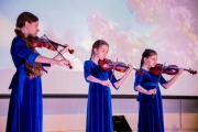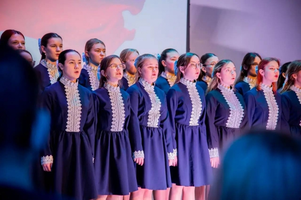 После танцевального пролога в исполнении ребят из ДШИ № 3 сводный хор воспитанниц школ искусств Мурманска исполнил гимн России, который зал выслушал стоя.