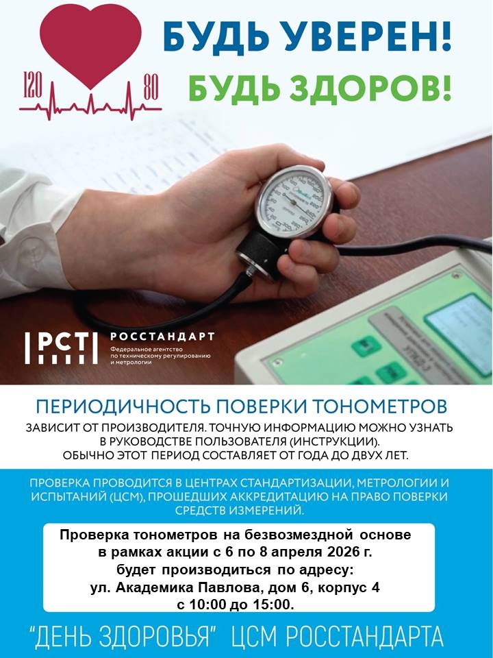 В период с 6 по 8 апреля 2026 года Федеральное агентство по техническому регулированию и метрологии (Росстандарт) и подведомственные ему организации проводят Всероссийскую акцию «Будь уверен! Будь здоров!» во всех федеральных округах Российской Федерации, приуроченную к Всемирному дню здоровья.