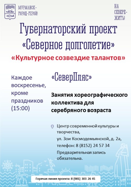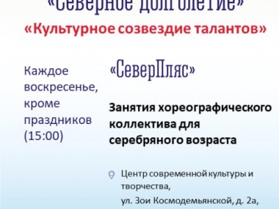 Каждое воскресенье, 15:00, Центр современной культуры и творчества (ул. Зои Космодемьянской, 2а, 24-57-34) Занятия хореографического коллектива «СеверПляс» для серебряного возраста. Предварительная запись обязательна.