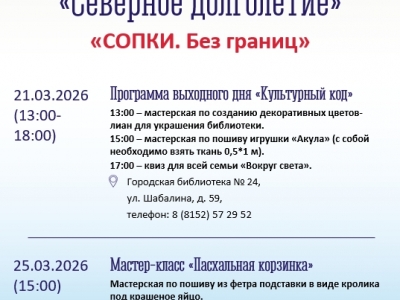 21 марта, 13:00 — 18:00, ул. Шабалина, 59 (городская библиотека № 24, тел. 57-29-52). Программа выходного дня «Культурный код» (творческие мастерские, квизы, выставки, мастер-классы).