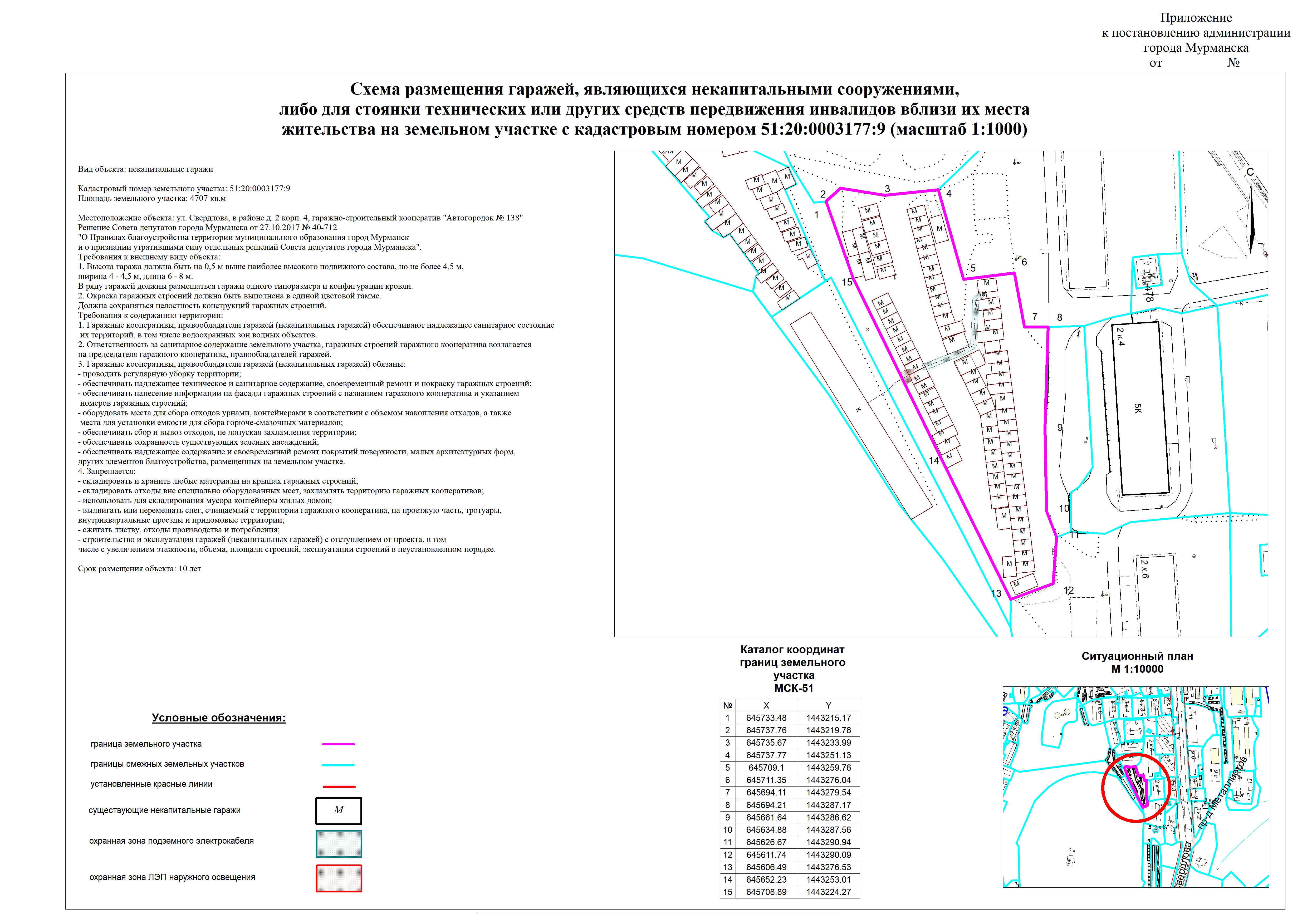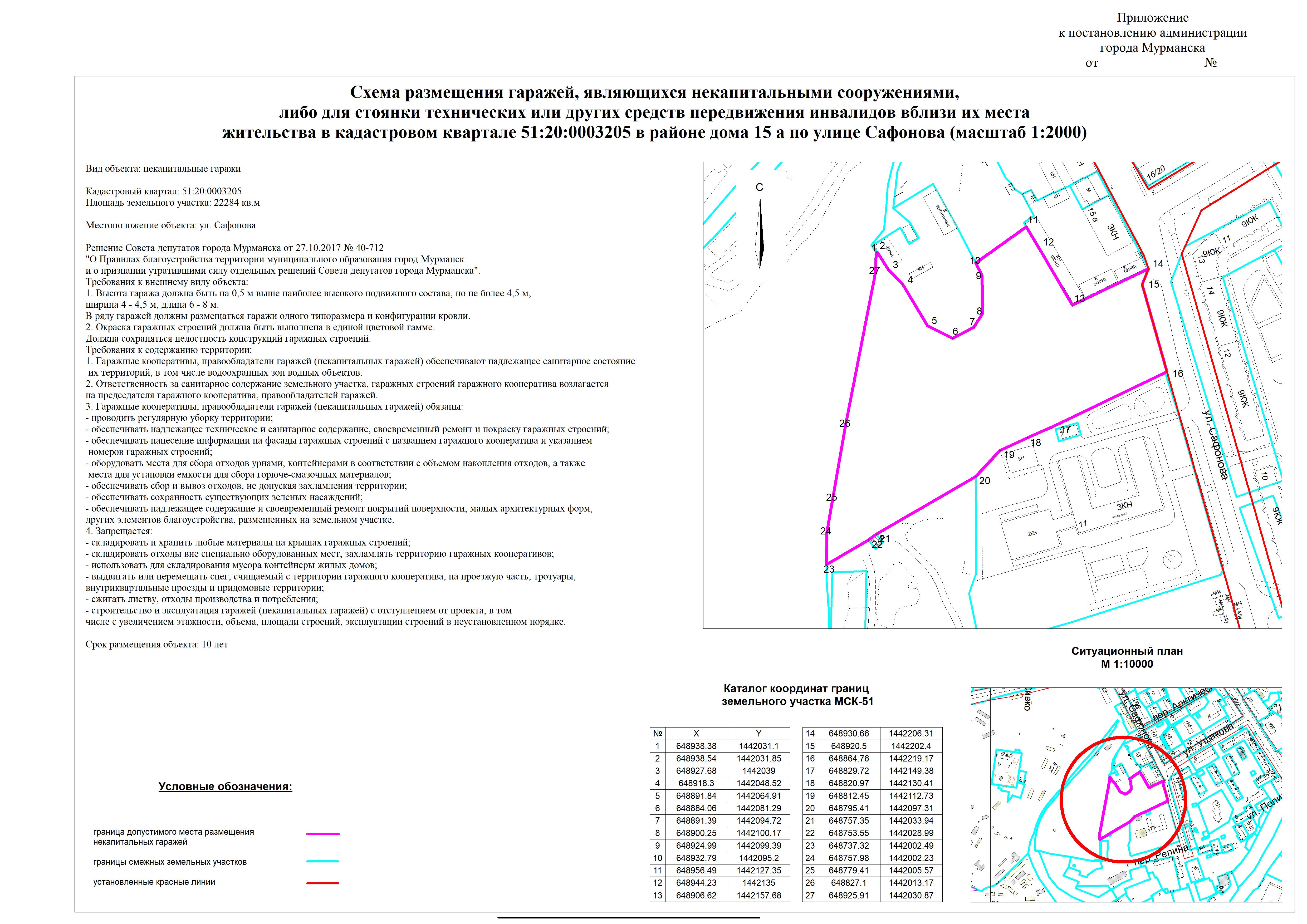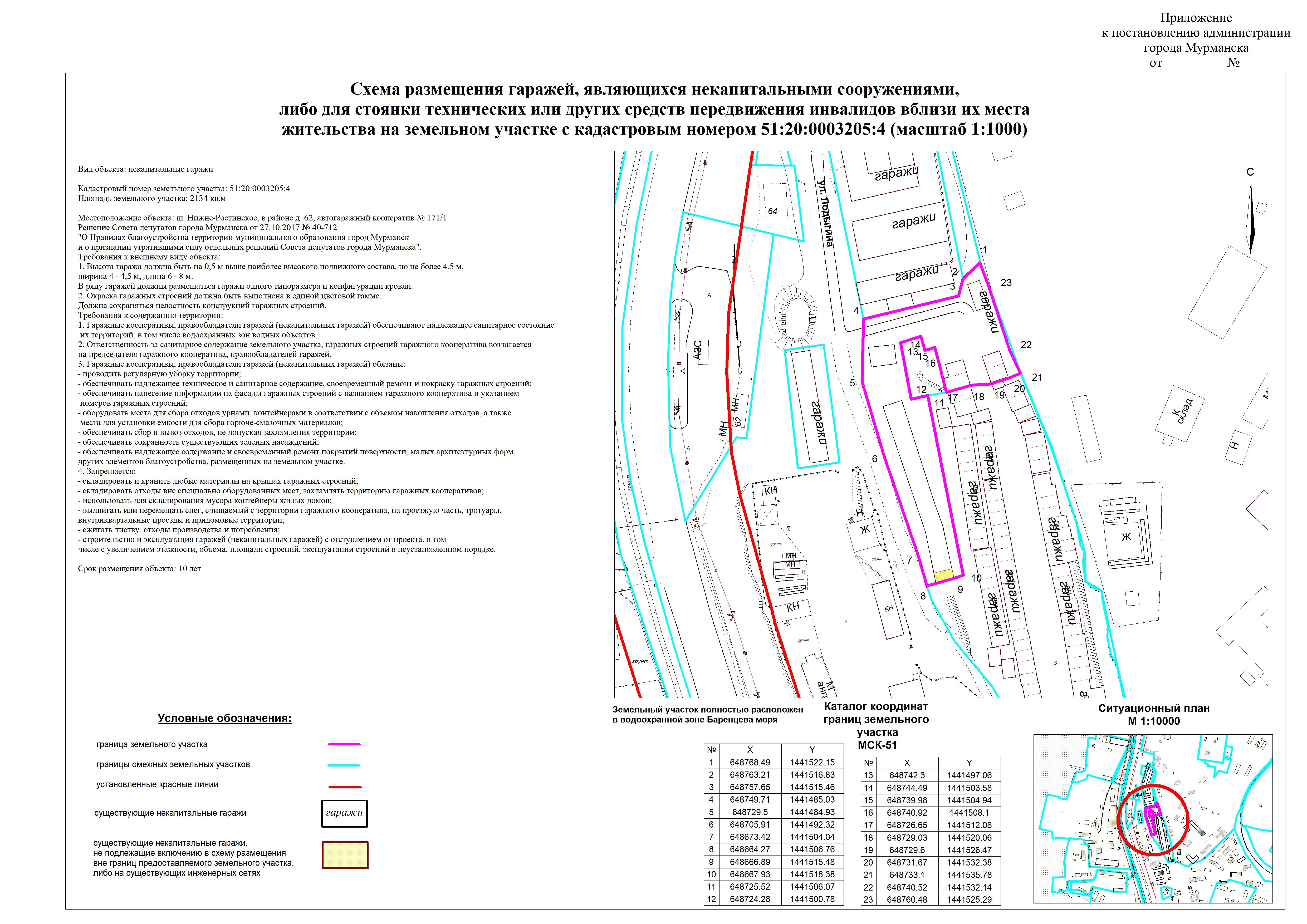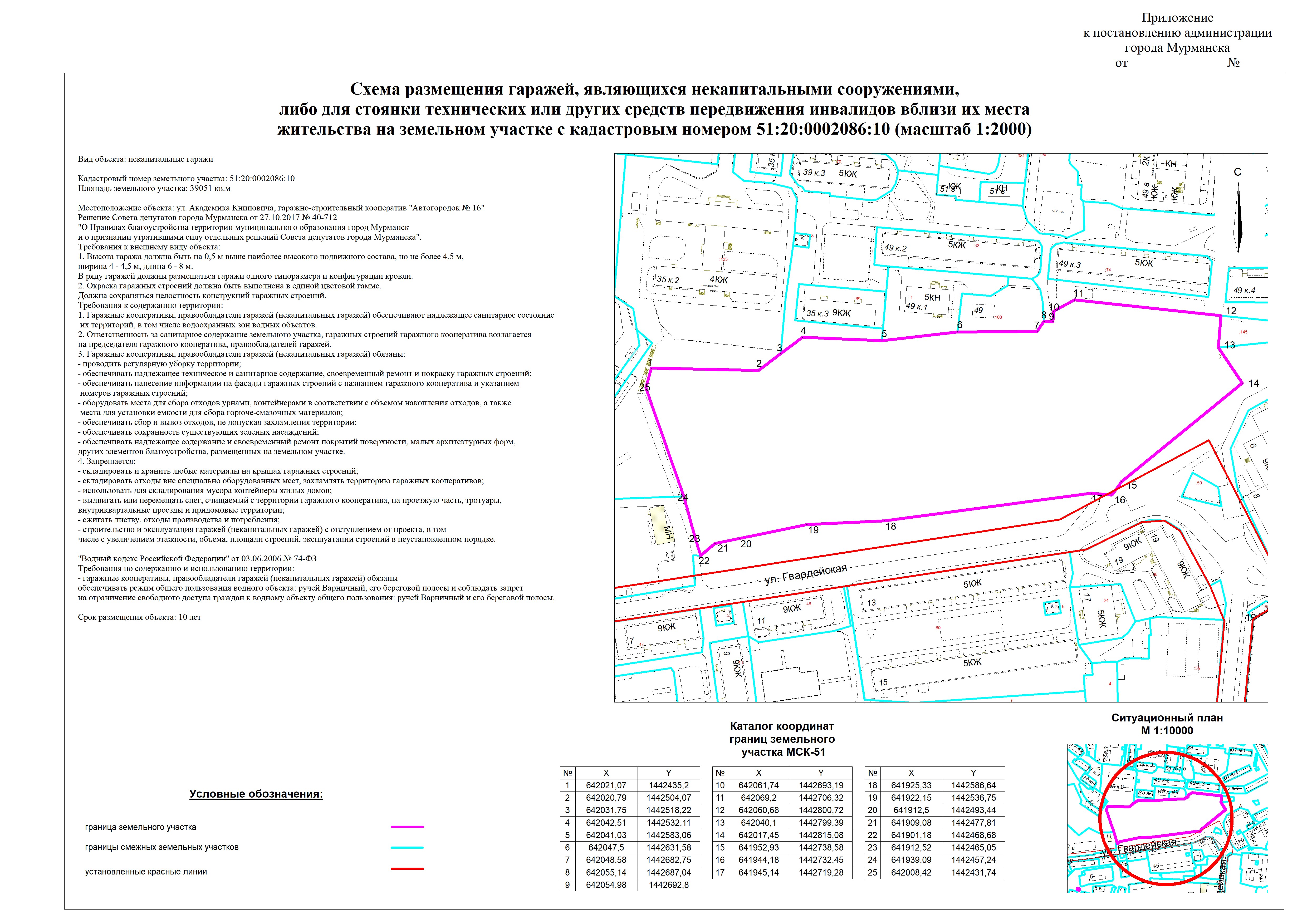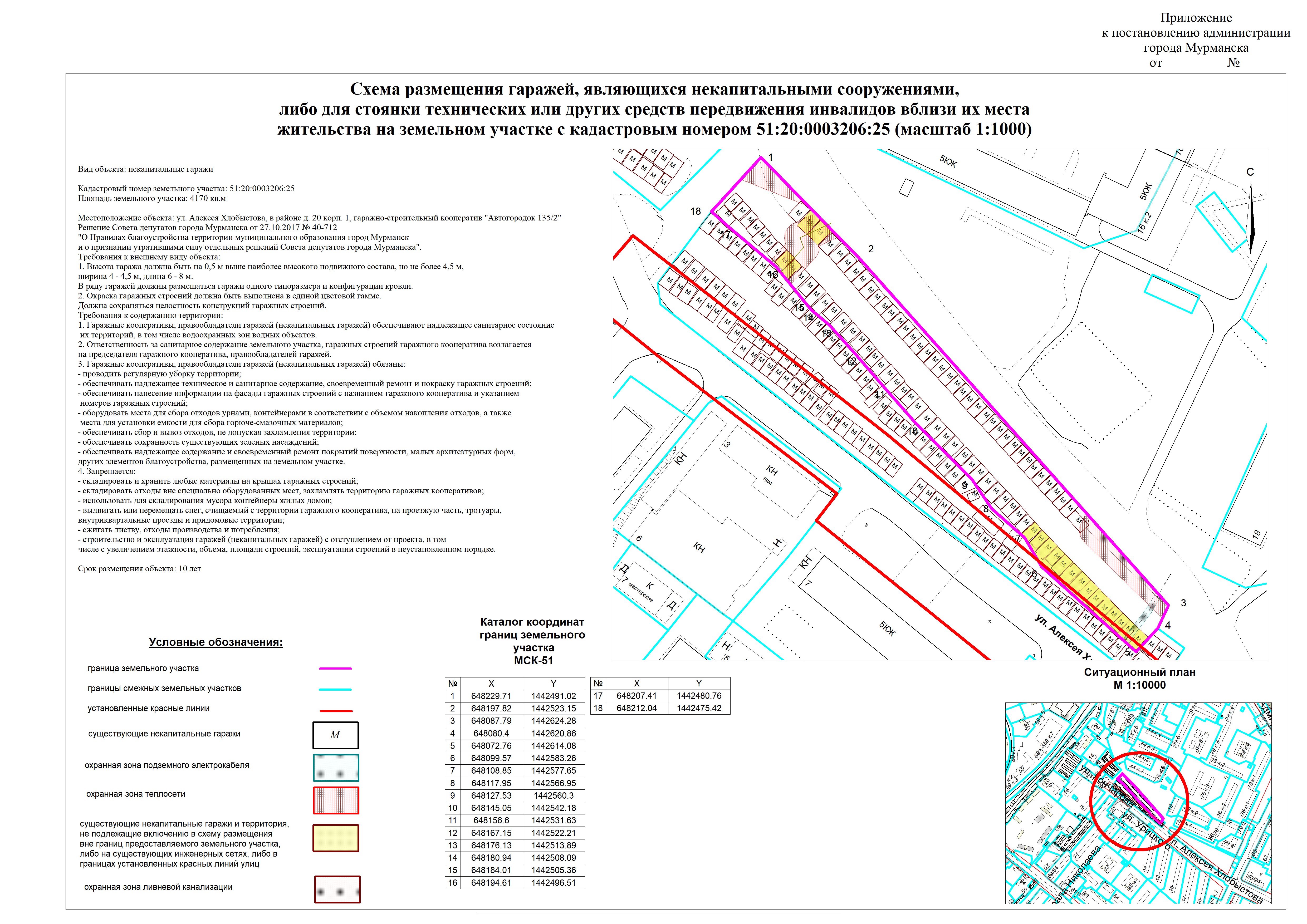 | Схема размещения объекта "некапитальные гаражи" на земельном участке с кадастровым номером 51:20:0002086:10 (внесение изменений в приложение к постановлению администрации города Мурманска от 12.05.2025 № 2029 «Об утверждении схемы размещения гаражей, являющихся некапитальными сооружениями, либо для стоянки технических или других средств передвижения инвалидов вблизи их места жительства на земельном участке с кадастровым номером 51:20:0002086:10» (в ред. постановления от 10.11.2025 № 6276)) |