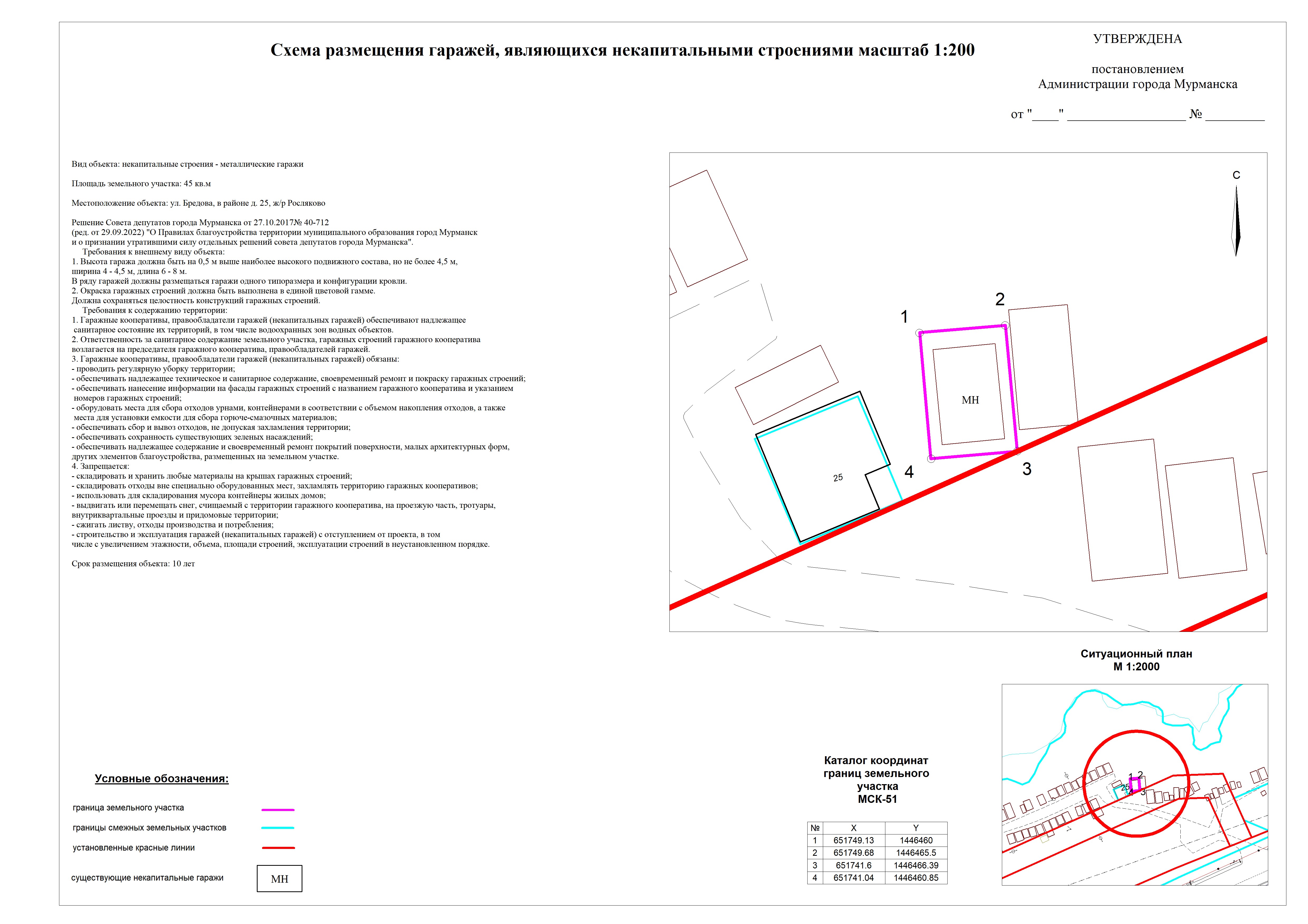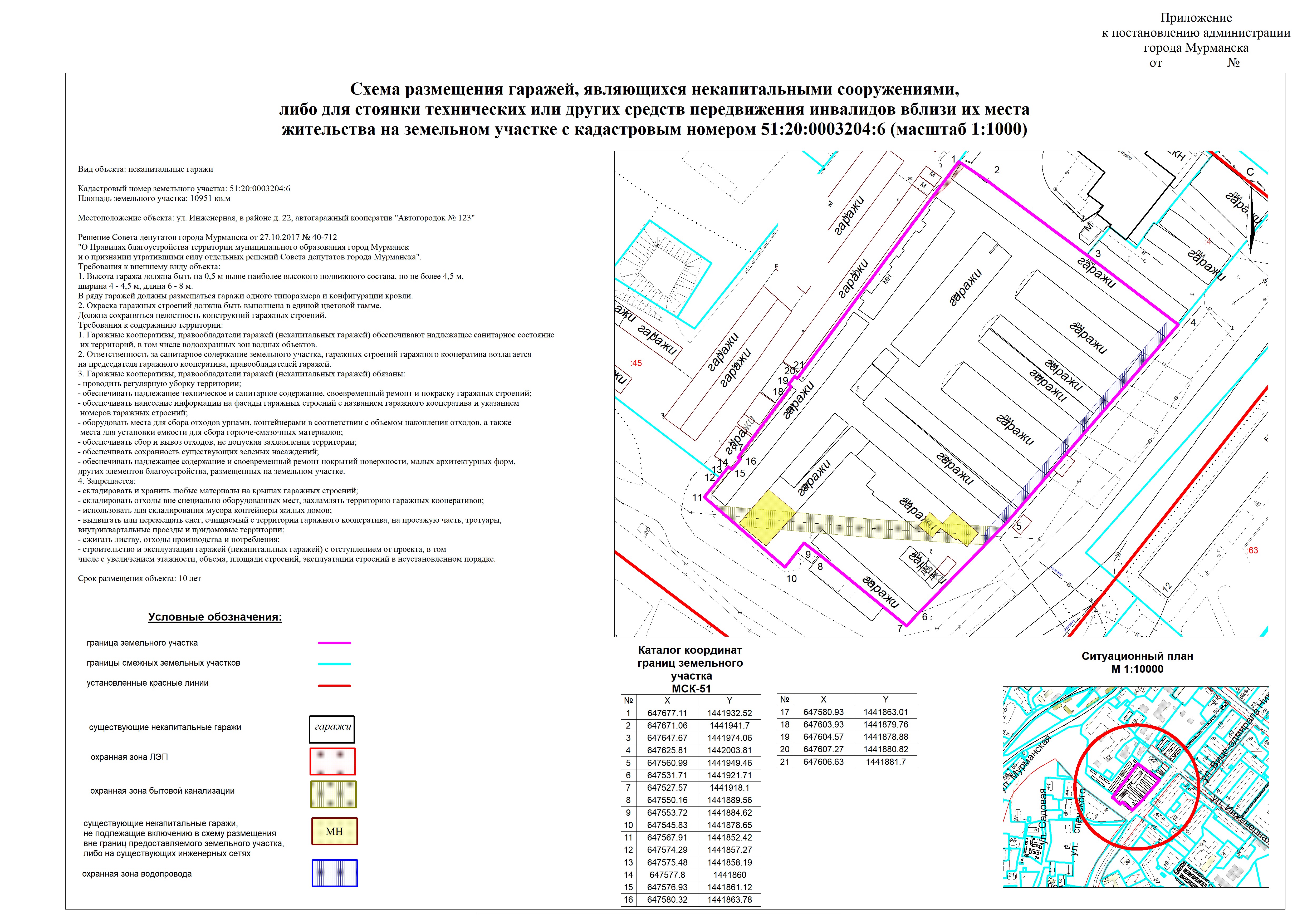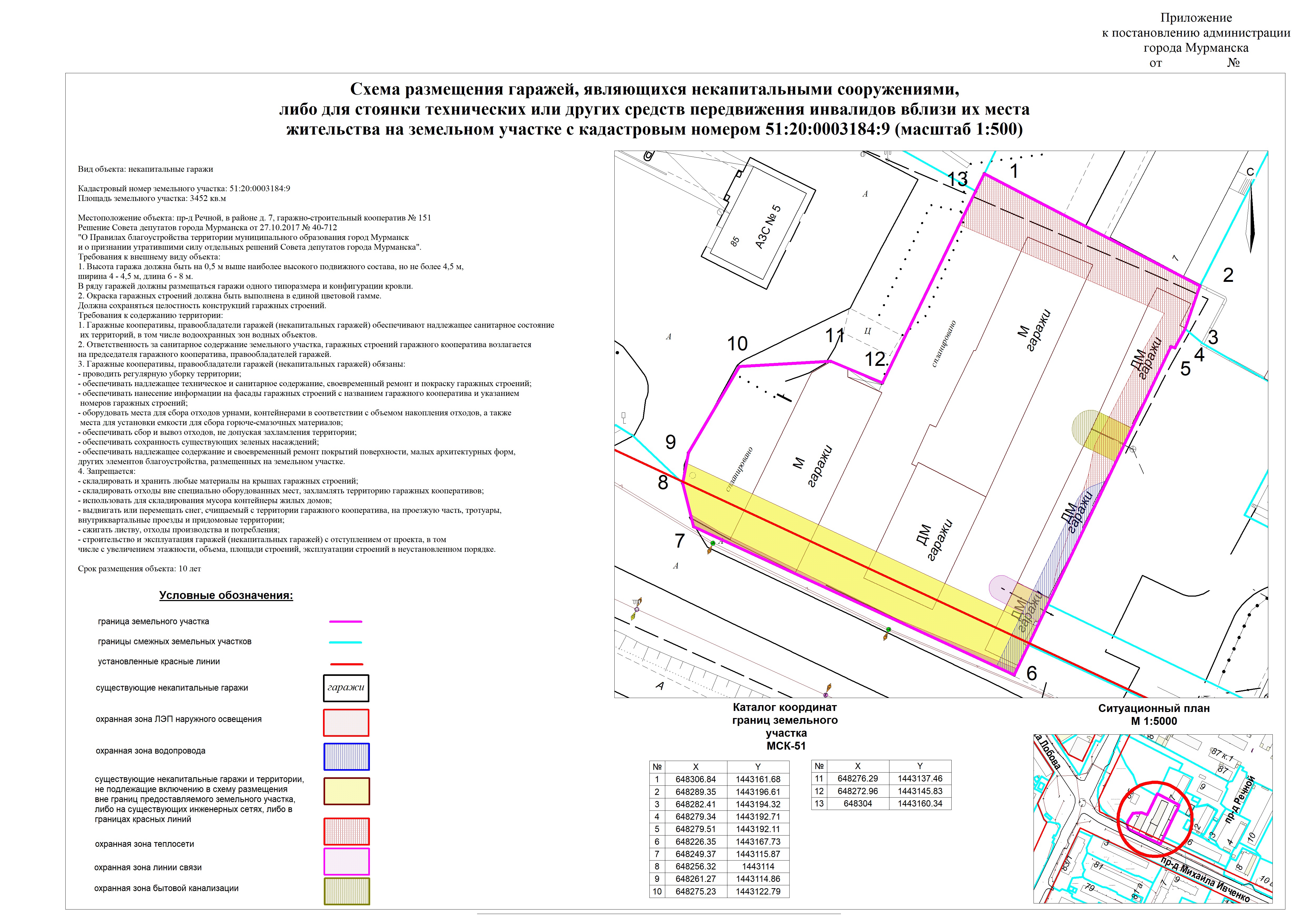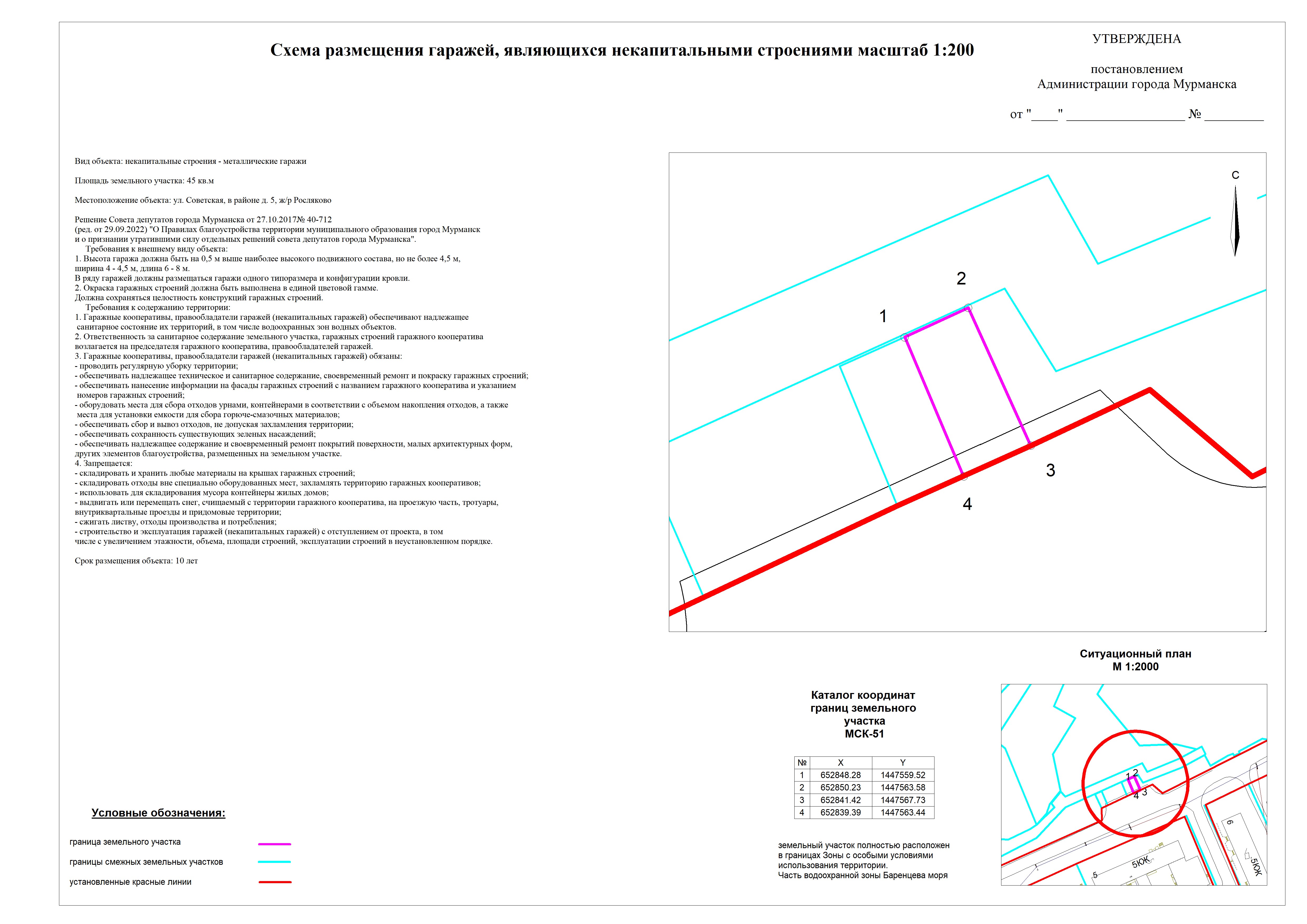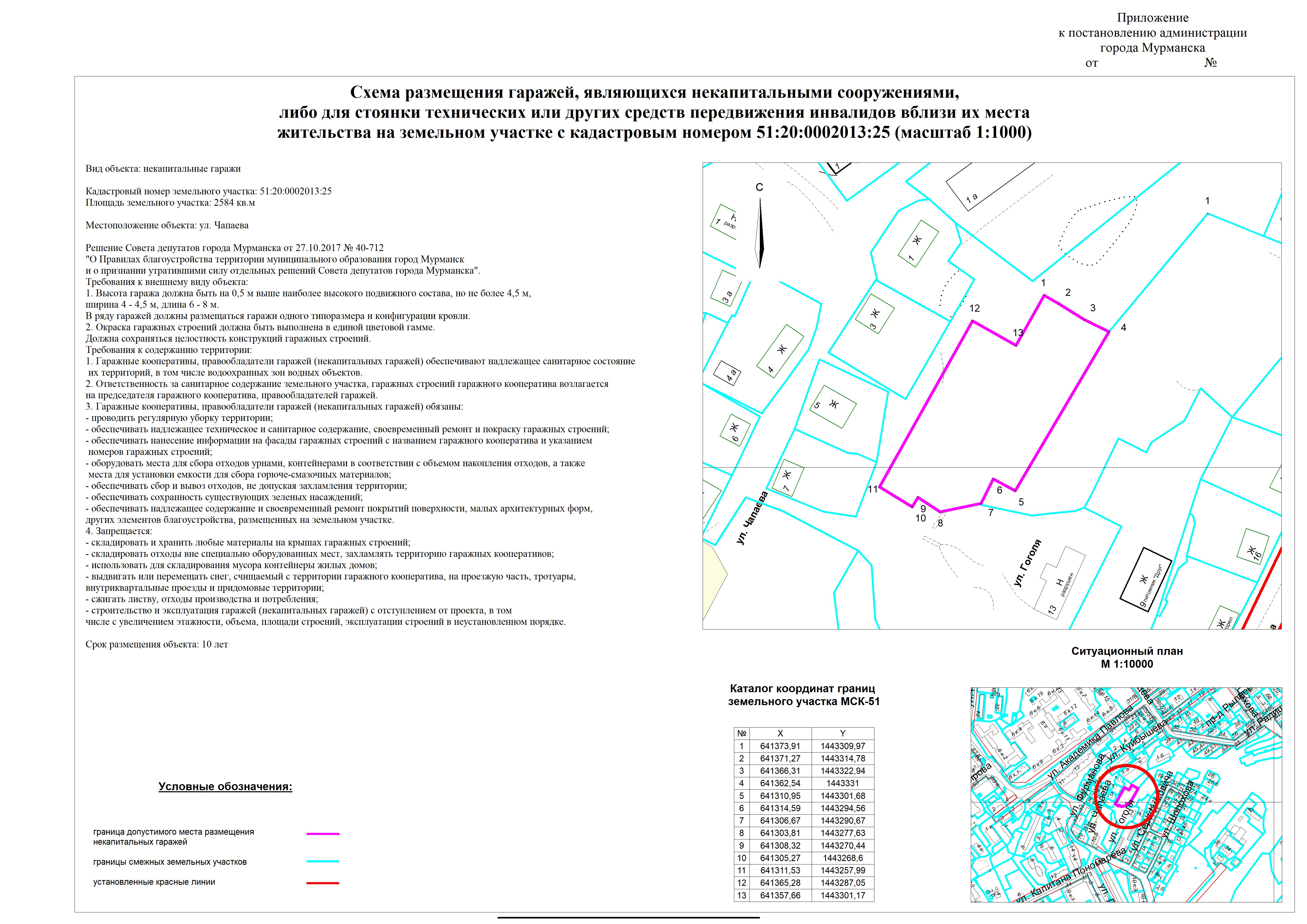 | Схема размещения объекта "некапитальные гаражи" на земельном участке с кадастровым номером 51:20:0002086:10 (внесение изменений в приложение к постановлению администрации города Мурманска от 12.05.2025 № 2029 «Об утверждении схемы размещения гаражей, являющихся некапитальными сооружениями, либо для стоянки технических или других средств передвижения инвалидов вблизи их места жительства на земельном участке с кадастровым номером 51:20:0002086:10» (в ред. постановления от 10.11.2025 № 6276)) |