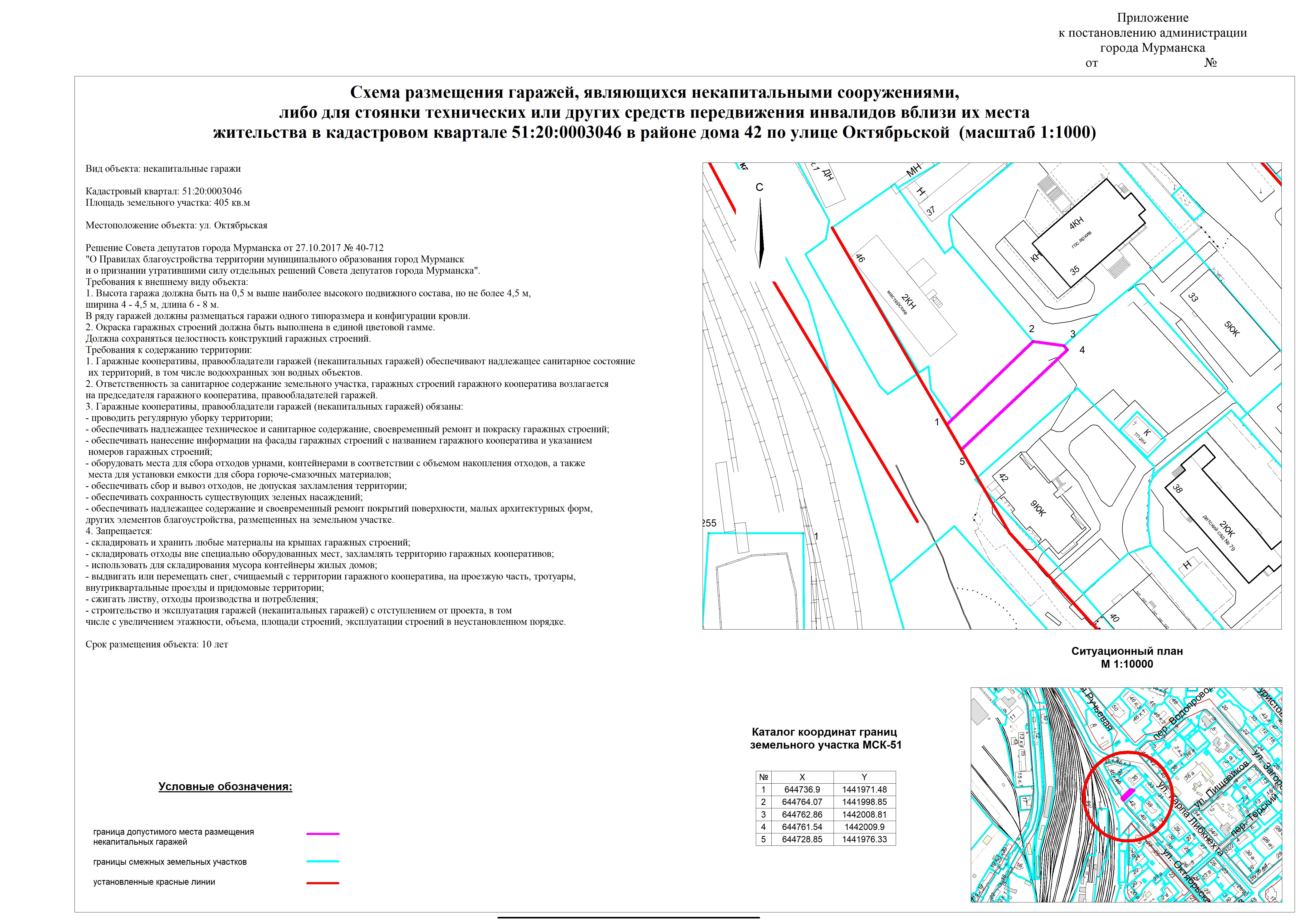 | Схема размещения объекта "некапитальные гаражи" в кадастровом квартале номер 51:20:0003046 в районе дома 42 по улице Октябрьской |