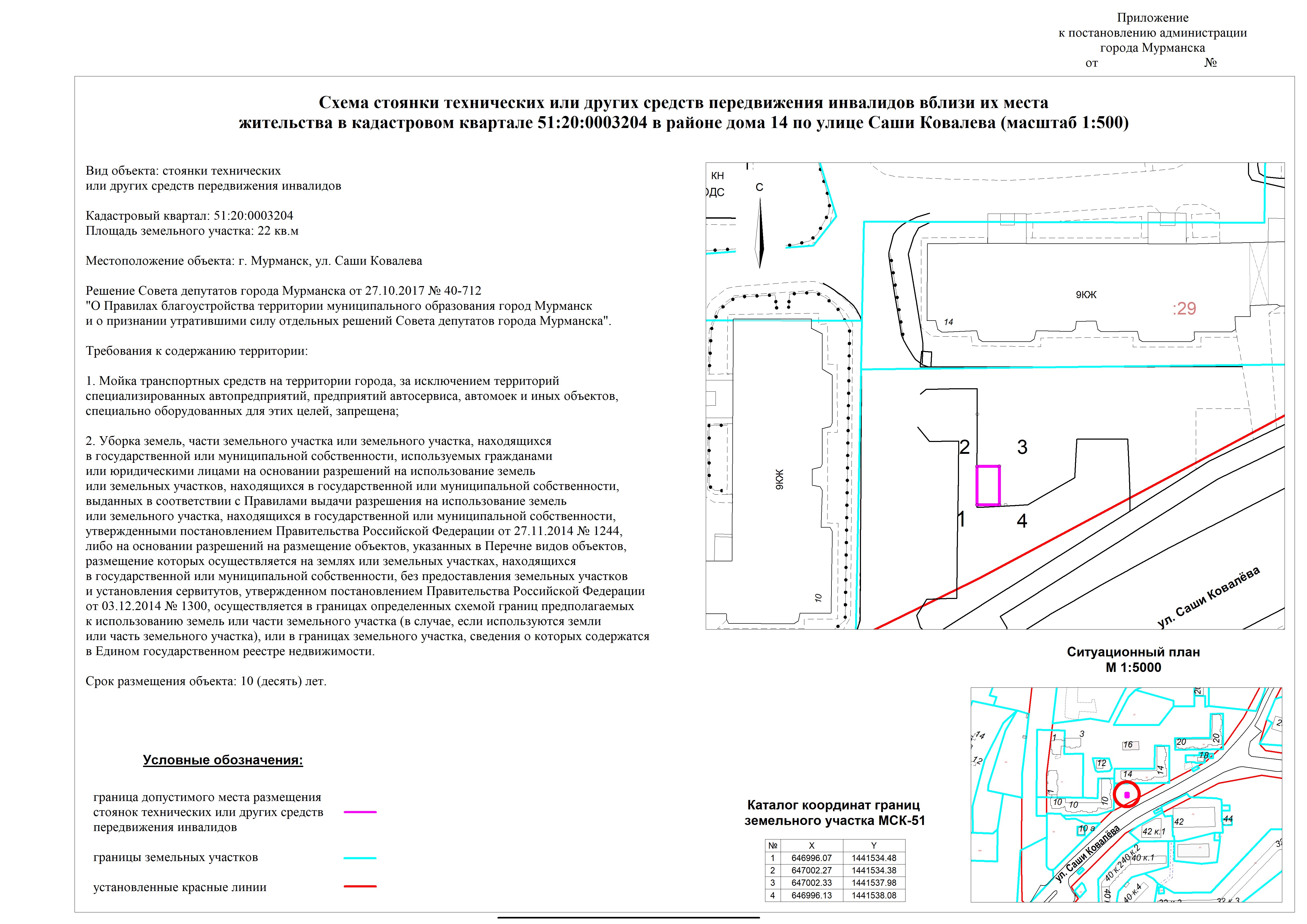 | Схема размещения объекта "стоянки технических или других средств передвижения инвалидов" в кадастровом квартале номер 51:20:0003204 в районе дома 14 по улице Саши Ковалева |