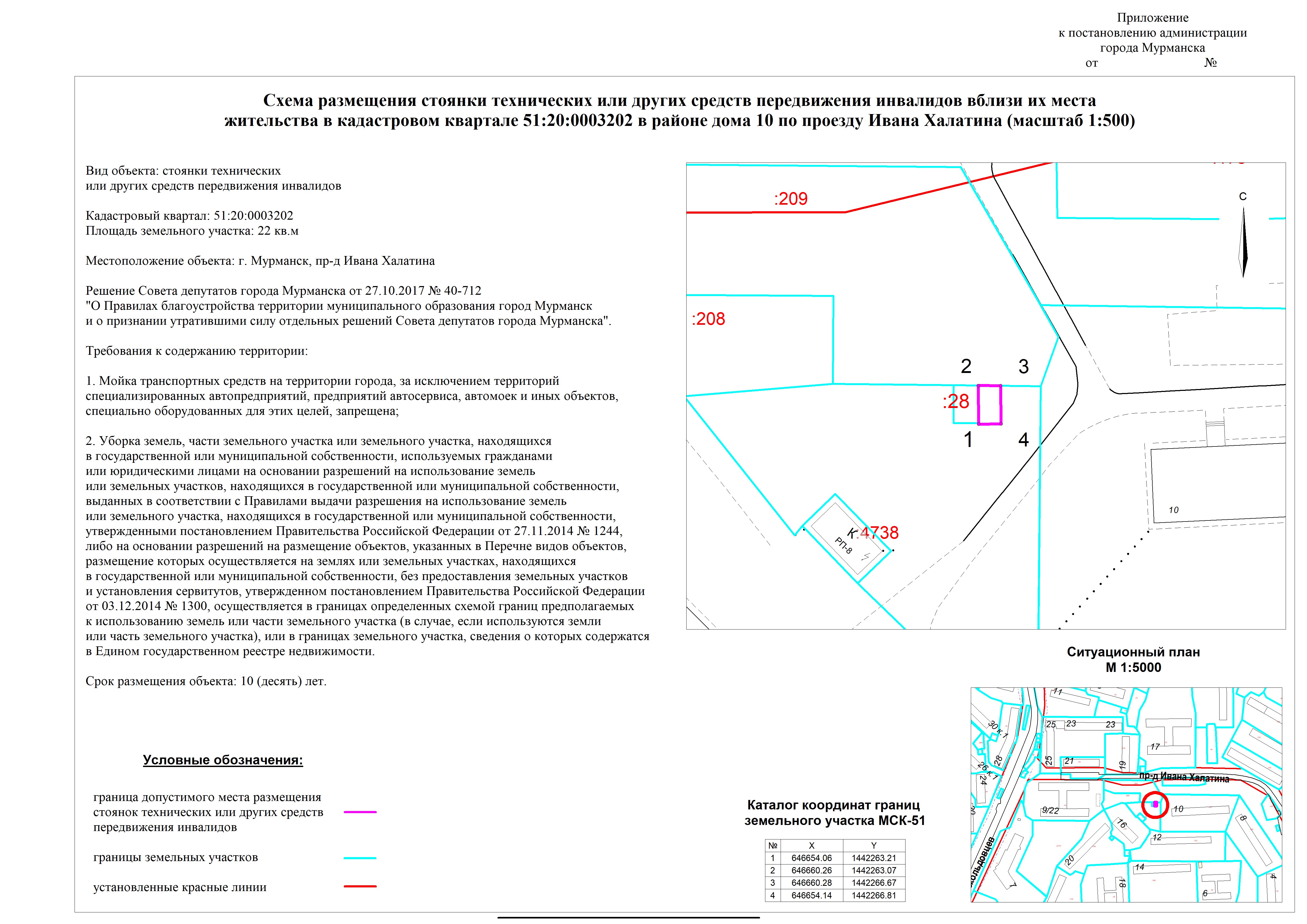 | Схема размещения объекта "стоянки технических или других средств передвижения инвалидов" в кадастровом квартале номер 51:20:0003202 в районе дома 10 по проезду Ивана Халатина |