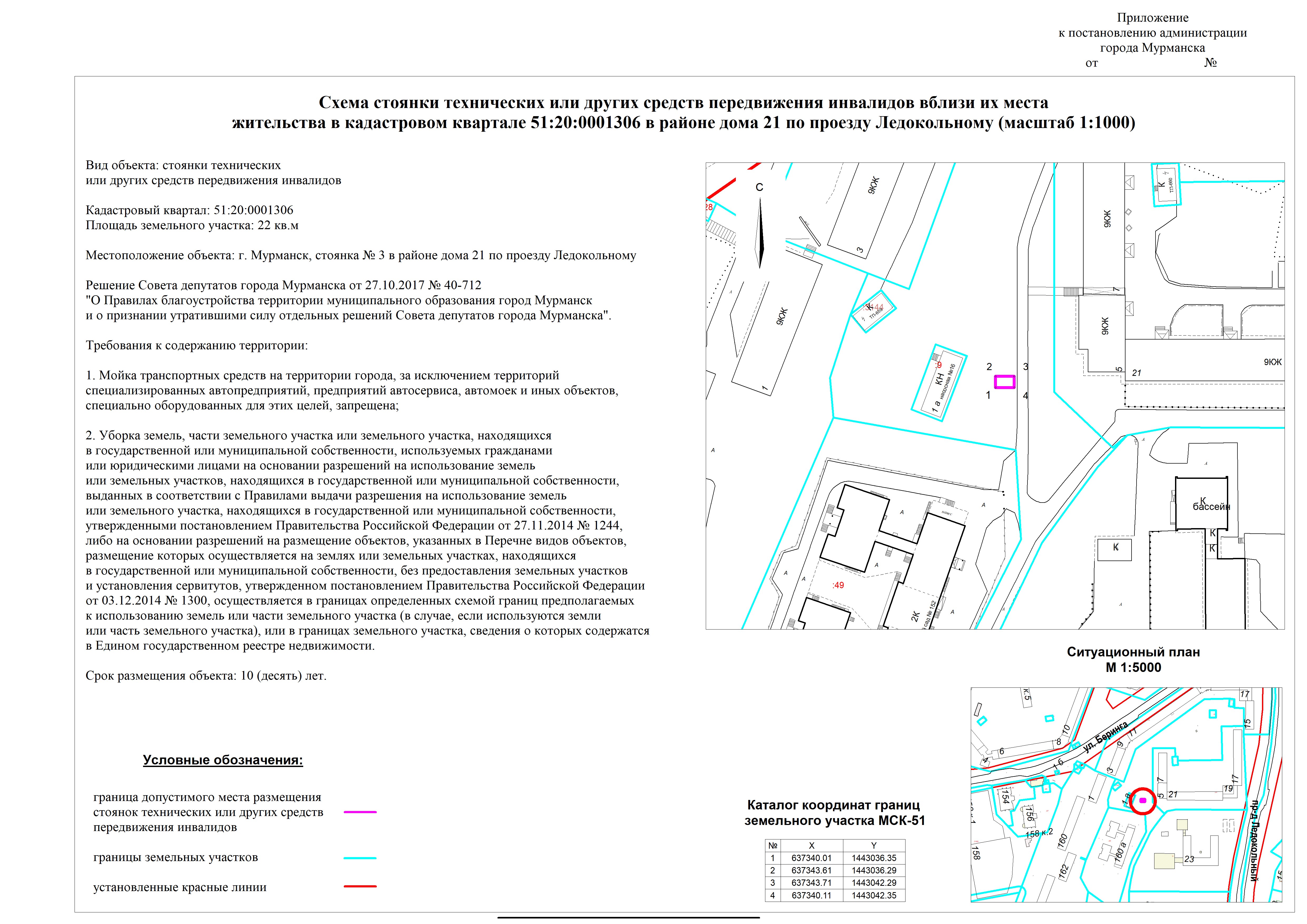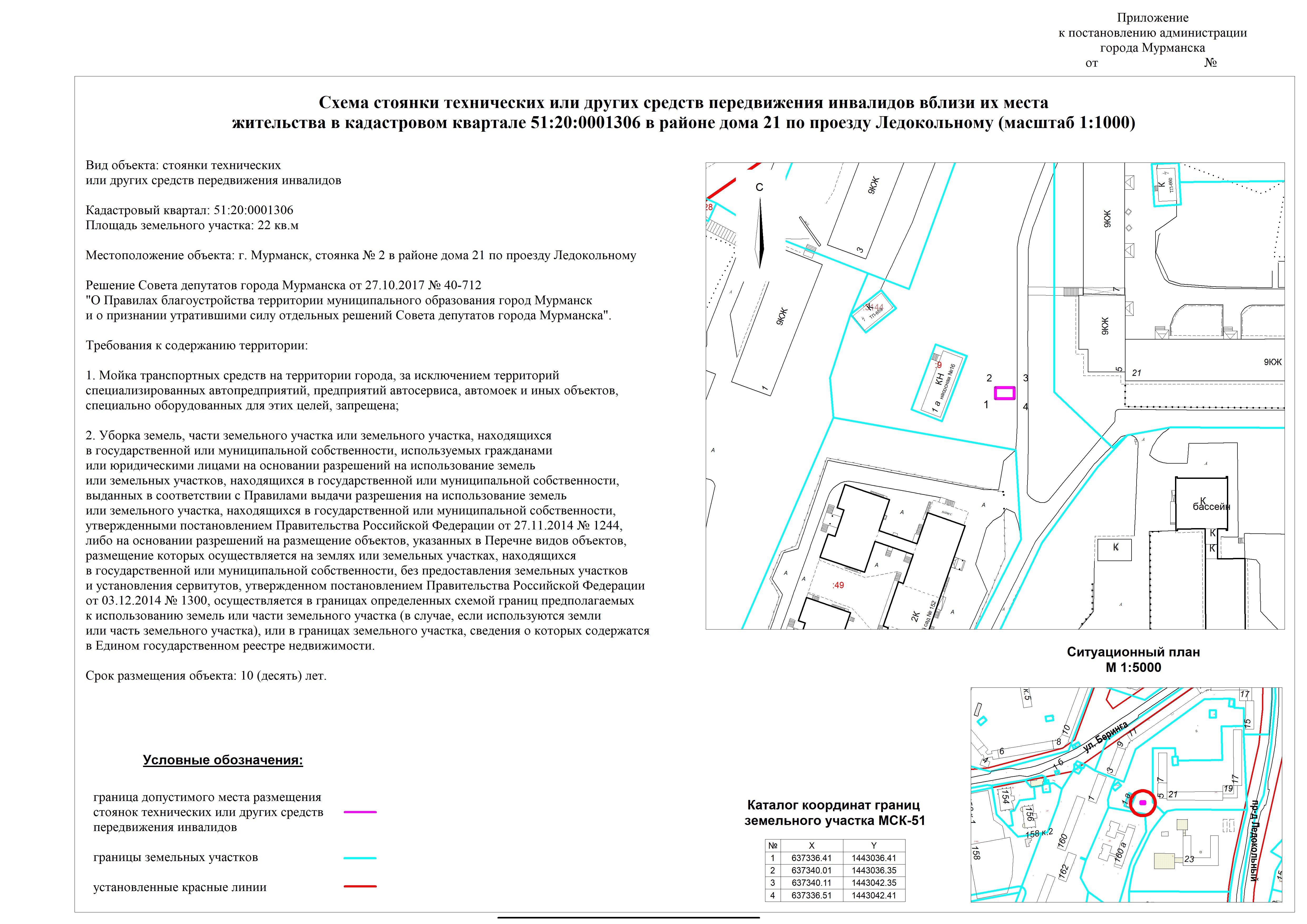 | Схема размещения объекта "стоянки технических или других средств передвижения инвалидов" в кадастровом квартале номер 51:20:0001306 в районе дома 21 по проезду Ледокольному |