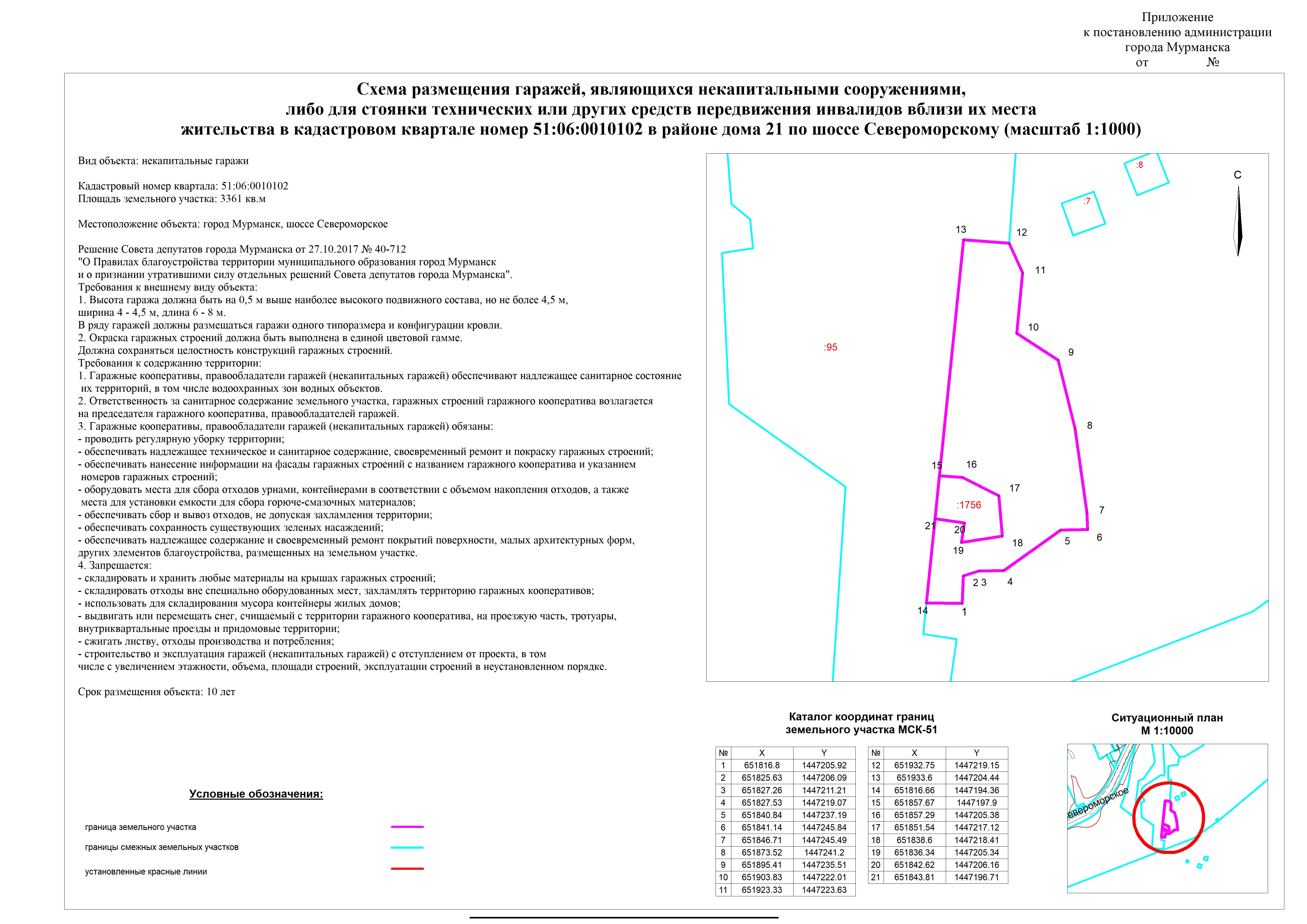 | Схема размещения объекта "некапитальные гаражи" в кадастровом квартале номер 51:06:0010102 в районе дома 21 по шоссе Североморскому |