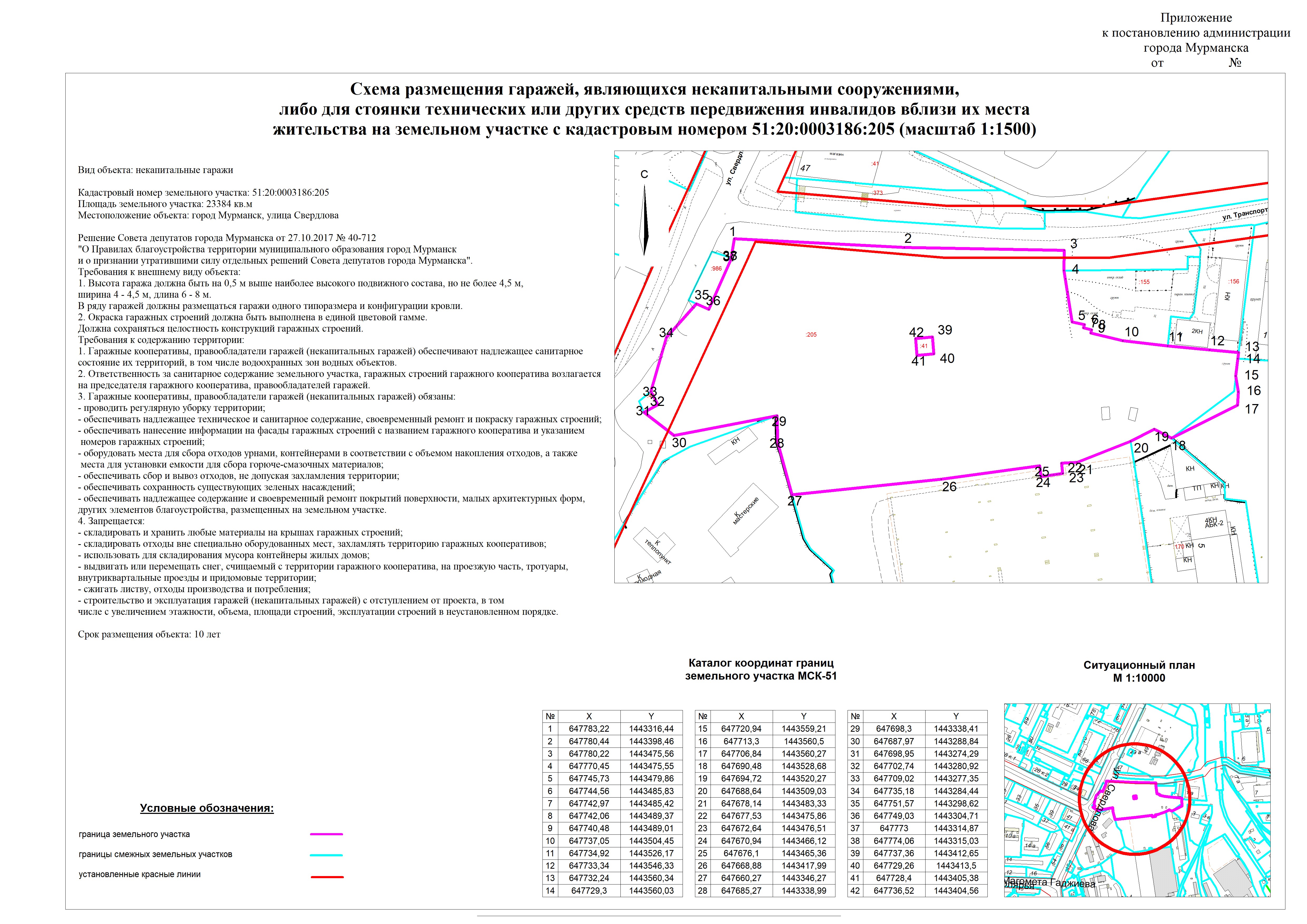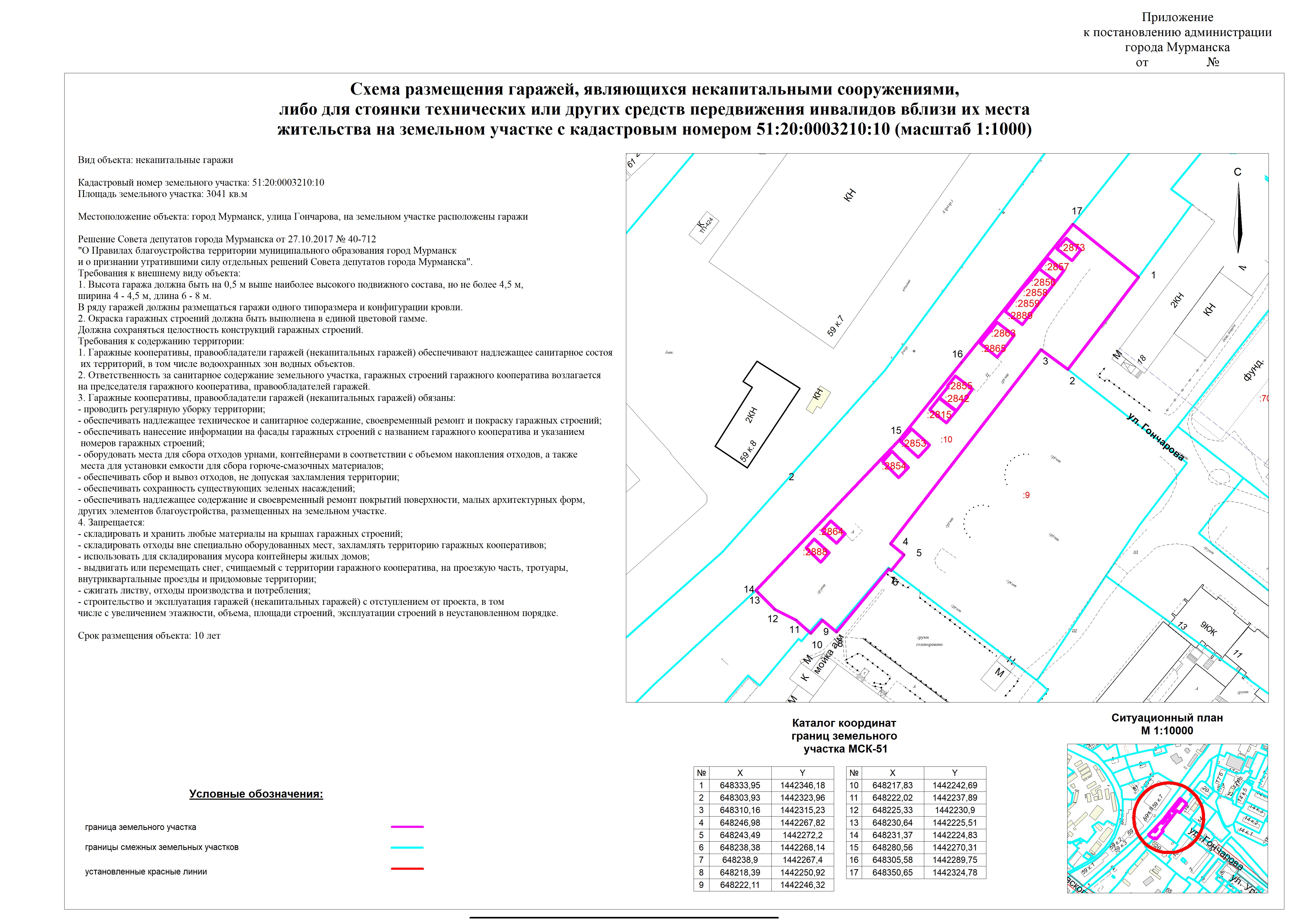 | Схема размещения объекта "некапитальные гаражи" на земельном участке с кадастровым номером 51:20:0002086:10 (внесение изменений в приложение к постановлению администрации города Мурманска от 12.05.2025 № 2029 «Об утверждении схемы размещения гаражей, являющихся некапитальными сооружениями, либо для стоянки технических или других средств передвижения инвалидов вблизи их места жительства на земельном участке с кадастровым номером 51:20:0002086:10» (в ред. постановления от 10.11.2025 № 6276)) |